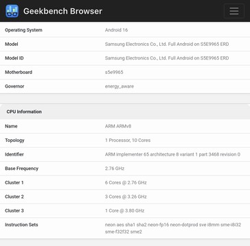 Den här listningen har Exynos 2600 med vad som verkar vara dess slutliga kärnkonfiguration: sex effektivitetskärnor som körs på 2,76 GHz, tre kärnor på 3,26 GHz och en huvudkärna på 3,80 GHz. Medan Exynos-chipset under de senaste generationerna vanligtvis har legat efter sina Qualcomm-rivaler, ser Exynos 2600 ut att vara en annorlunda affär.