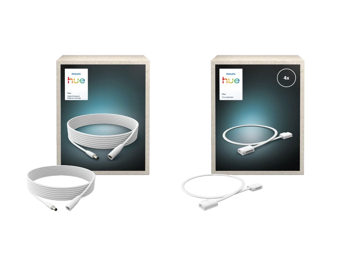 Hue Flux Connector är I-formad, medan Flux Corner Connector är L-formad. Båda kan användas för att ansluta delar av Flux-ljusremsan för att skapa en längre längd. Flux Flex Connector är ett alternativt sätt att ansluta två ljuslistsektioner på ett stort avstånd, men det kommer att orsaka ett avbrott i belysningen. Flux Cable Extension gör att lamporna kan placeras på längre avstånd från strömkällan. Dessutom kan Flux-fästet för montering användas för att fästa ljuslisten på en vägg eller i taket, med en transparent klämdesign.
