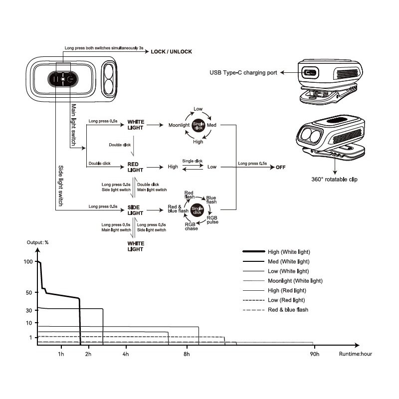 Detta gör att huvudljuset, som består av två lysdioder, kan riktas åt olika håll efter behov. Ljuset avges också i en 40-graders vinkel, vilket är användbart när det fästs i en jackficka eller på en ryggsäcksrem. Den levererar upp till 300 lumen eller en räckvidd på 151 fot. Fenix listar batteritiden till 1 timme och 40 minuter i detta höga läge, men noterar att temperaturreglering gäller här. Med andra ord dimmas lysdioderna om enheten blir för varm.