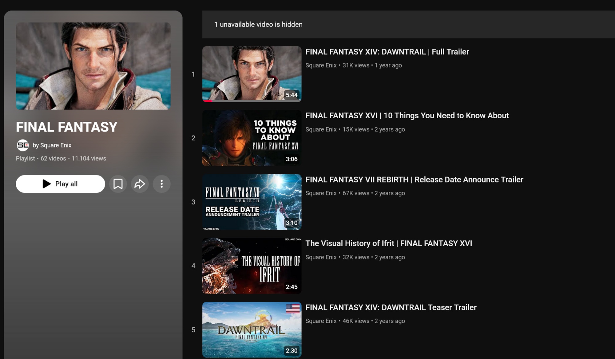 YouTube-spellistan visar trailers som främjar stora tillägg till den populära RPG-serien. En video för Final Fantasy 14: Dawntrail-expansionen var det senaste nya urvalet, publicerat 2024. Utgivare förbereder ofta innehåll i förväg, men håller medierna olistade tills de avslöjas. Med det sagt har spelare sett liknande privata poster från Rockstar som inte resulterade i en ny GTA 6 trailer.
