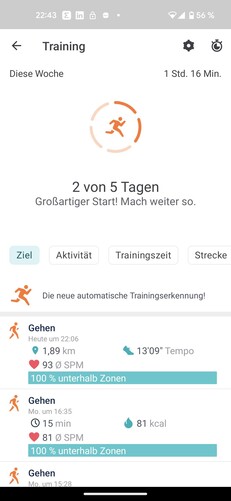 Smartklockan ger också information om höjdmeter, förbrukade kalorier och effekter på den dagliga statistiken. Den automatiska träningsdetektionen fungerade tillförlitligt i testet.