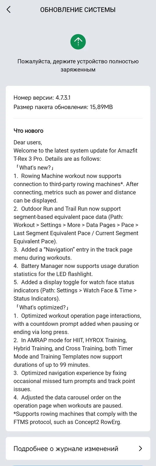 Med firmwareversion 4.7.3.1 kan T-Rex 3 Pro-användare nu ansluta en FTMS-kompatibel roddmaskin från tredje part till smartklockan för att samla in effekt- och distansmätningar under roddmaskinens träningspass. För Outdoor Run- och Trail Run-aktiviteter kan du nu visa motsvarande tempodata per segment. På menyn för spårningssidan under träningen finns ett nytt navigeringsavsnitt. Dessutom kan Amazfit smartwatchs batterihanterare nu visa data kopplade till bärarens integrerade LED-ficklampa.