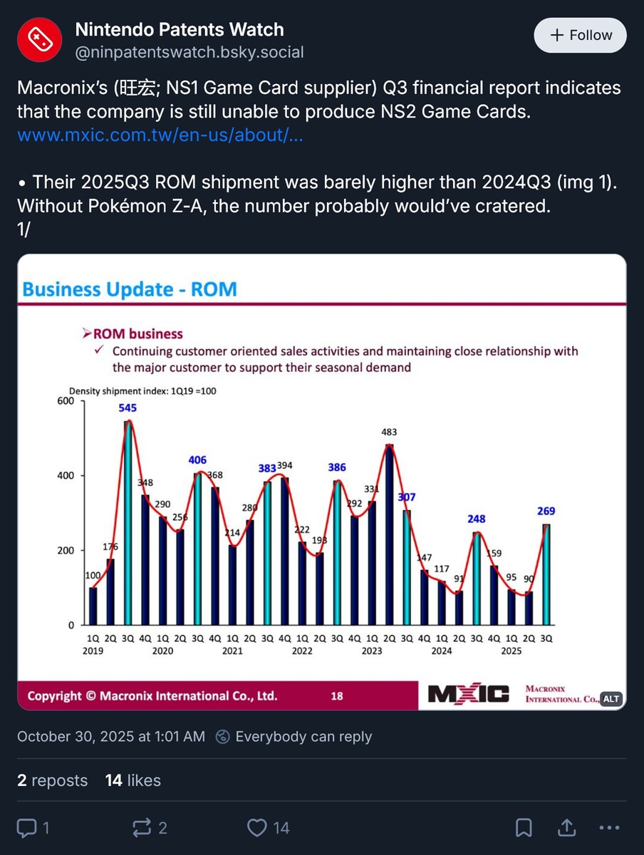 Nintendo Patents Watch på Bluesky diskuterade en kvartalsvis finansiell rapport som släpptes av det taiwanesiska företaget. Macronix ordförande nämnde förseningar inom forskning och utveckling, vilket har påverkat Switch 2-planerna. Tillverkaren har dock en mer hoppfull syn på "ROM-verksamheten" år 2026.