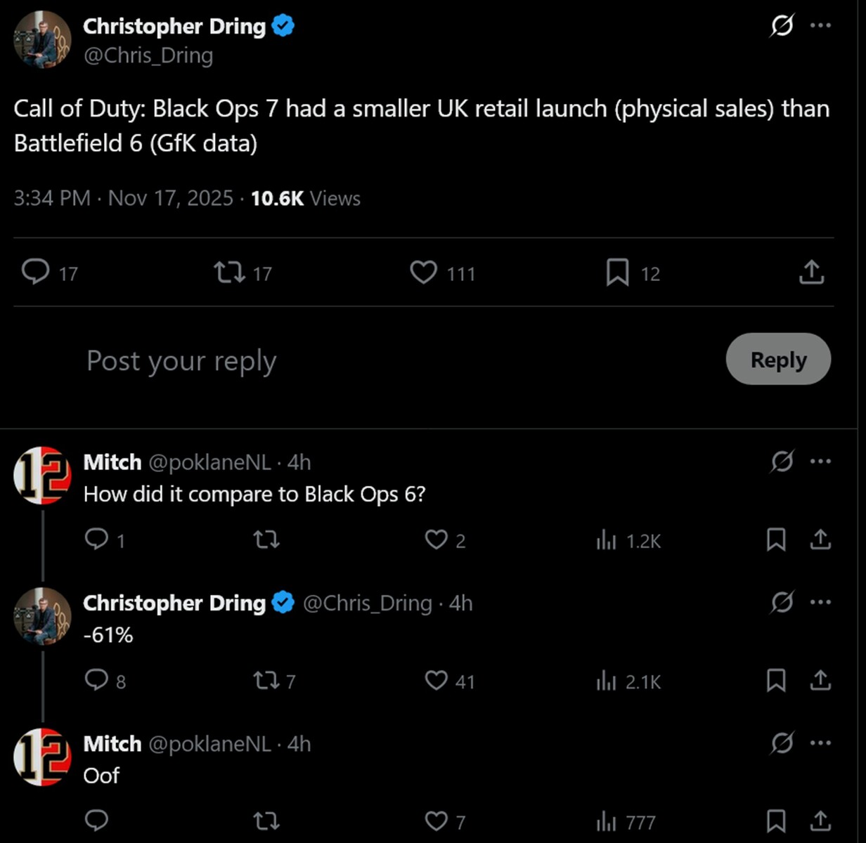 Christopher Dring från The Game Business retade den tidiga statistiken på sociala medier. Exakta siffror tillhandahålls inte, men Dring avslöjade att det senaste Call of Duty-spelet spelar ikapp sin EA-rival. Black Ops 7-försäljningen ligger också betydligt bakom tidigare poster i serien.