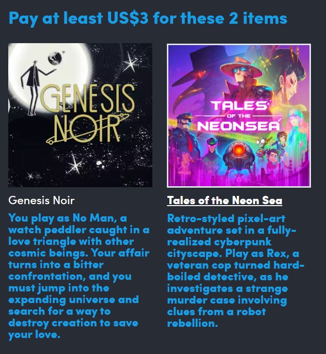 - Tales of the Neon Sea: Detta retro-pixel peka-och-klicka-spel släpper dig in i en neonbelyst cyberpunkstad där du är detektiv Rex. Du jagar ledtrådar och löser ett seriemordsfall från 13 år sedan. Tales of the Neon Sea kostar $16,99 på Steam och har för närvarande 4 500 recensioner, varav 87% är positiva.