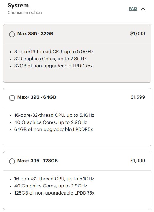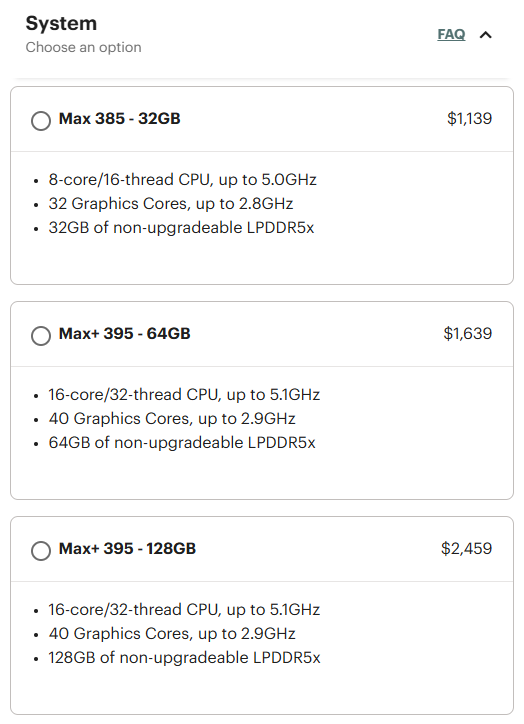 Toppmodellen drabbades särskilt hårt av prishöjningen eftersom den kräver åtta 128-Gbit-chip, vars kostnader har stigit kraftigt. Konfigurationen med 128 GB säljs nu för 2 459 $, vilket motsvarar ett hopp på 460 $. Även om det högre priset kan göra den här versionen mindre tilltalande för AI-utvecklare, är Framework Desktop fortfarande en stark utmanare mot minidatorer med liknande specifikationer, till exempel GMKtec Evo-X2 med samma processor och 128 GB RAM(ca 2 300 USD på Amazon).