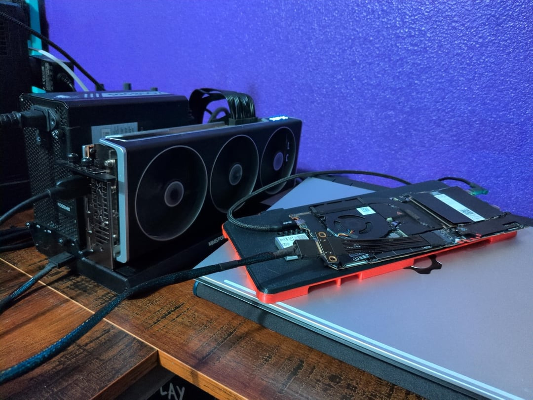 Projektet började helt enkelt: ett Framework Ultra 7 165H-moderkort (från en mystisk låda) med en 7900XTX GPU genom en DEG1 Oculink-docka (för närvarande 99,99 USD på Amazon). Hela systemet är inrymt i ett anpassat, aktivt kylt hölje som designats och skrivits ut av skaparen, som itererade genom flera 3D-modeller och utskriftsförsök för att uppnå det nuvarande resultatet. Ett Corsair 850W PSU levererar de nödvändiga musklerna, medan aktiv kylning på moderkortet och trippel 120 mm fläktar för GPU: n håller allt stabilt.
