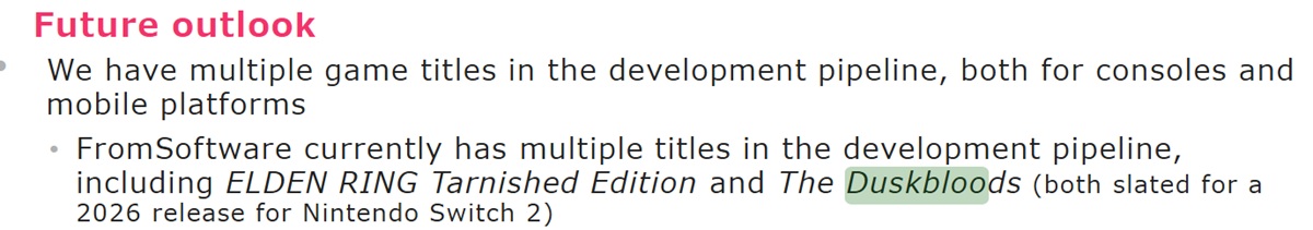 Kadokawa inkluderade en uppdatering i sin rapport Q3 Räkenskapsåret 2026. När man diskuterade minskande rörelseresultat jämfört med föregående år hänvisade det till Växla 2 spel. The Duskbloods och Elden Ring Tarnished Edition är "båda planerade för 2026-utgåvan."