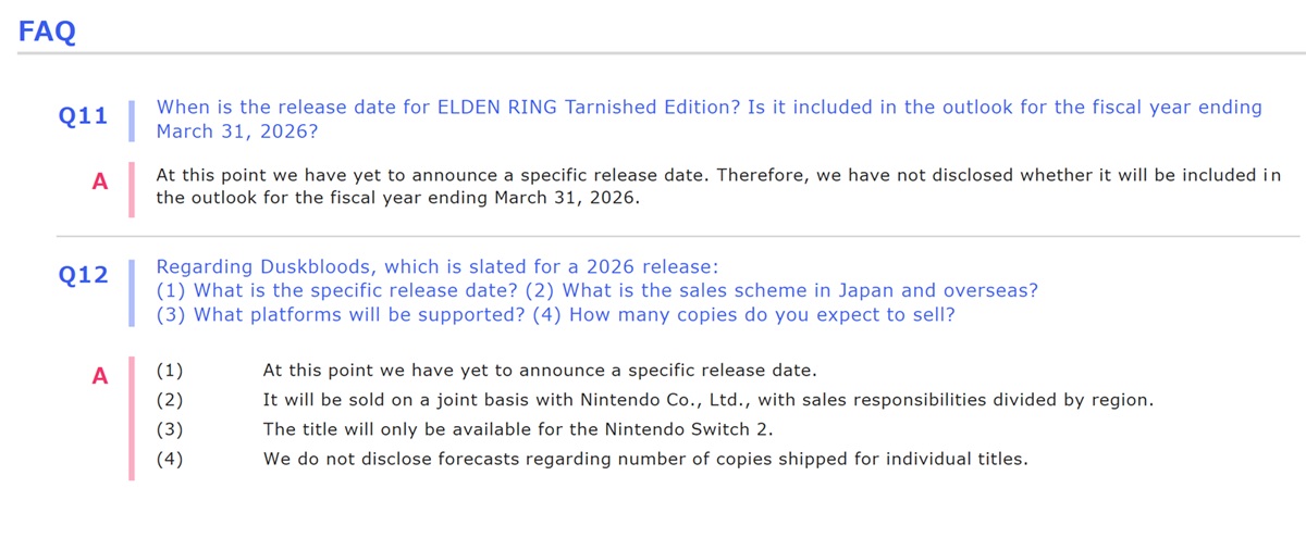 Insåg att investerare skulle ha fler frågor, tog företaget upp båda titlarna i en FAQ. Tyvärr begränsade det inte ankomsttiderna för FromSoftware-ansträngningarna. Det avböjde också att erbjuda försäljningsprognoser, även om Nintendos handhållna kunde ge en ekonomisk boost.