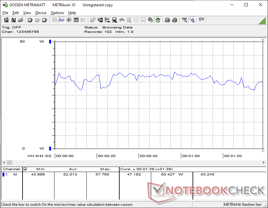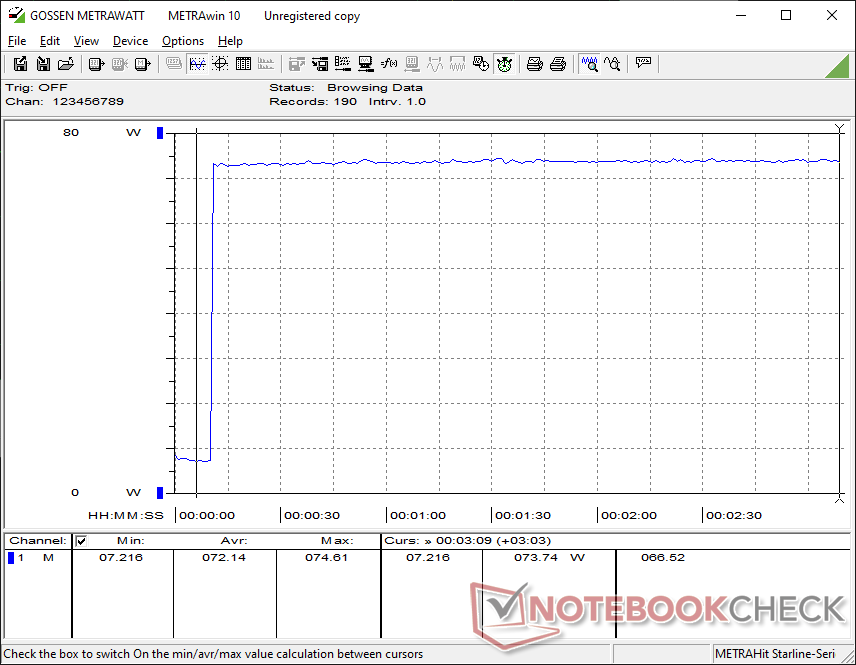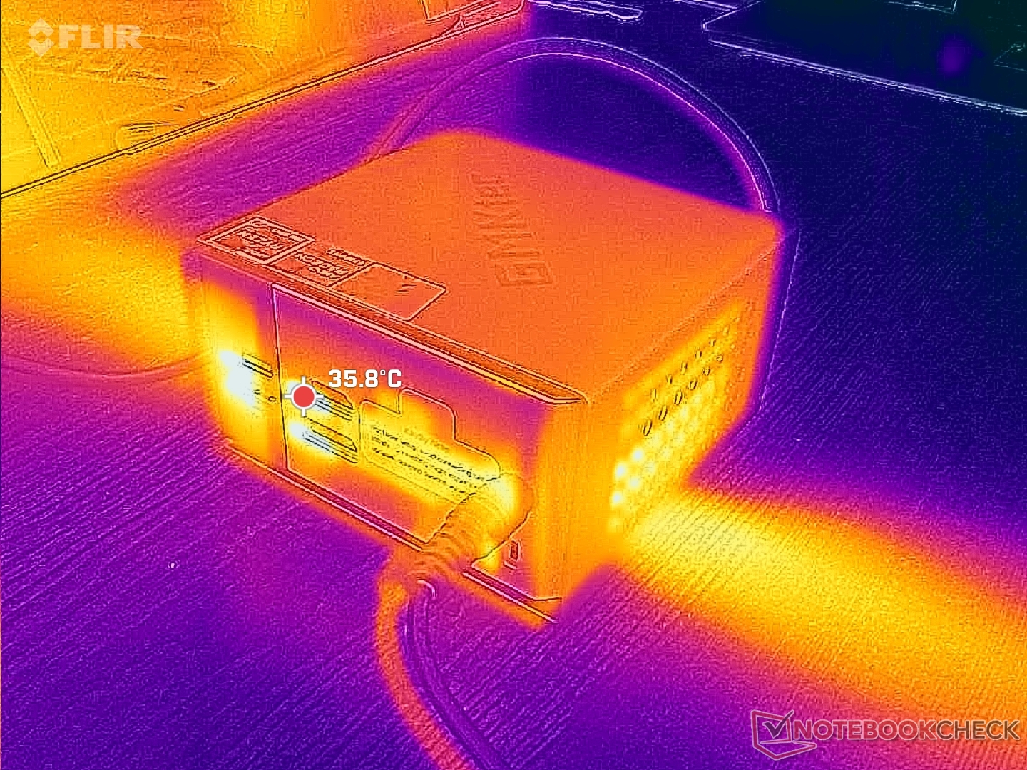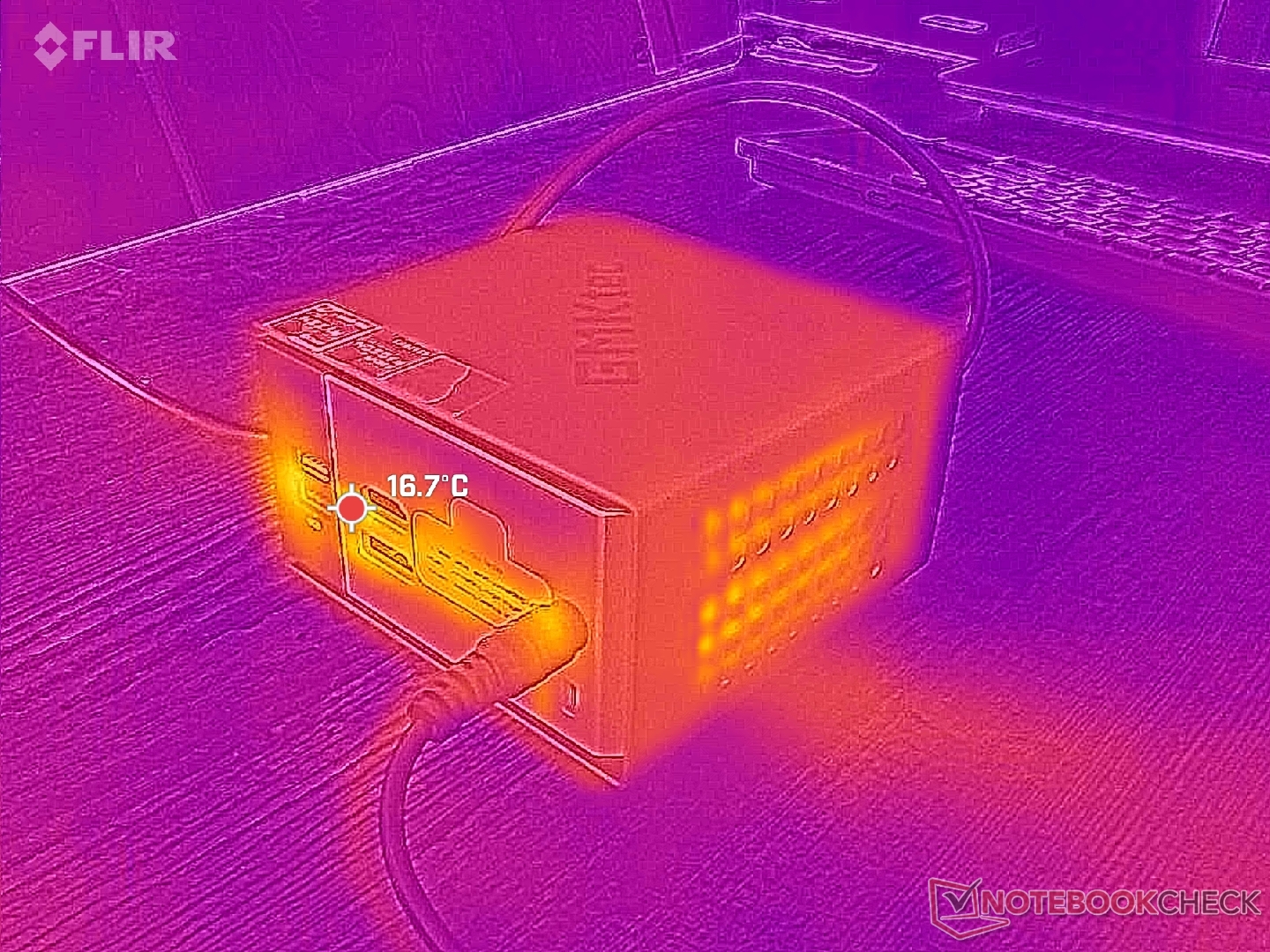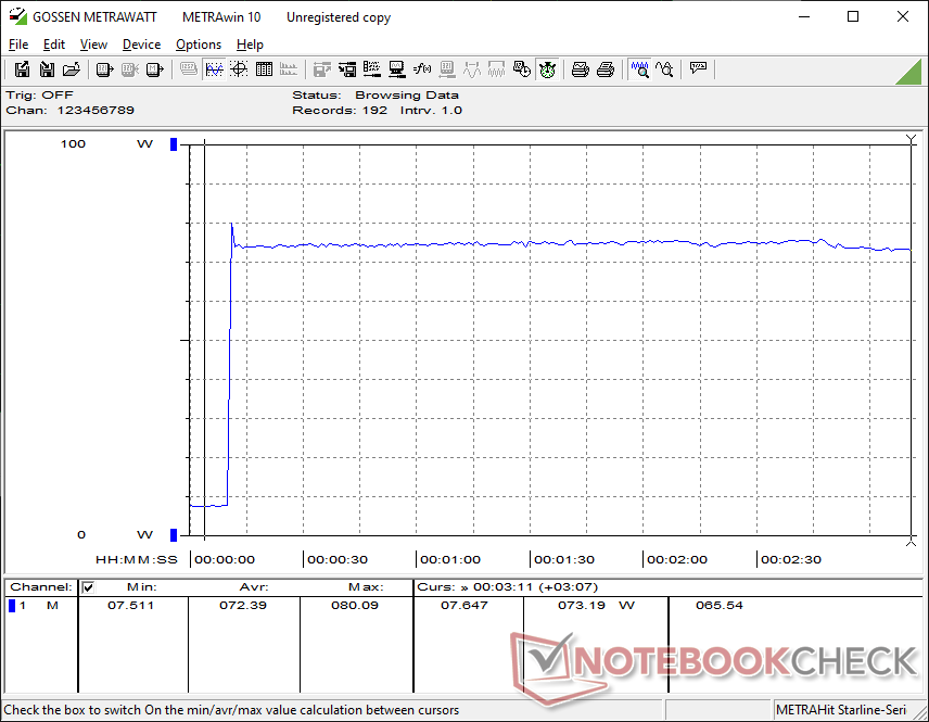 Vi kan mäta ett maximalt uttag på 80 W från den medelstora (~13,3 x 5,8 x 3,2 cm) 120 W AC-adaptern.