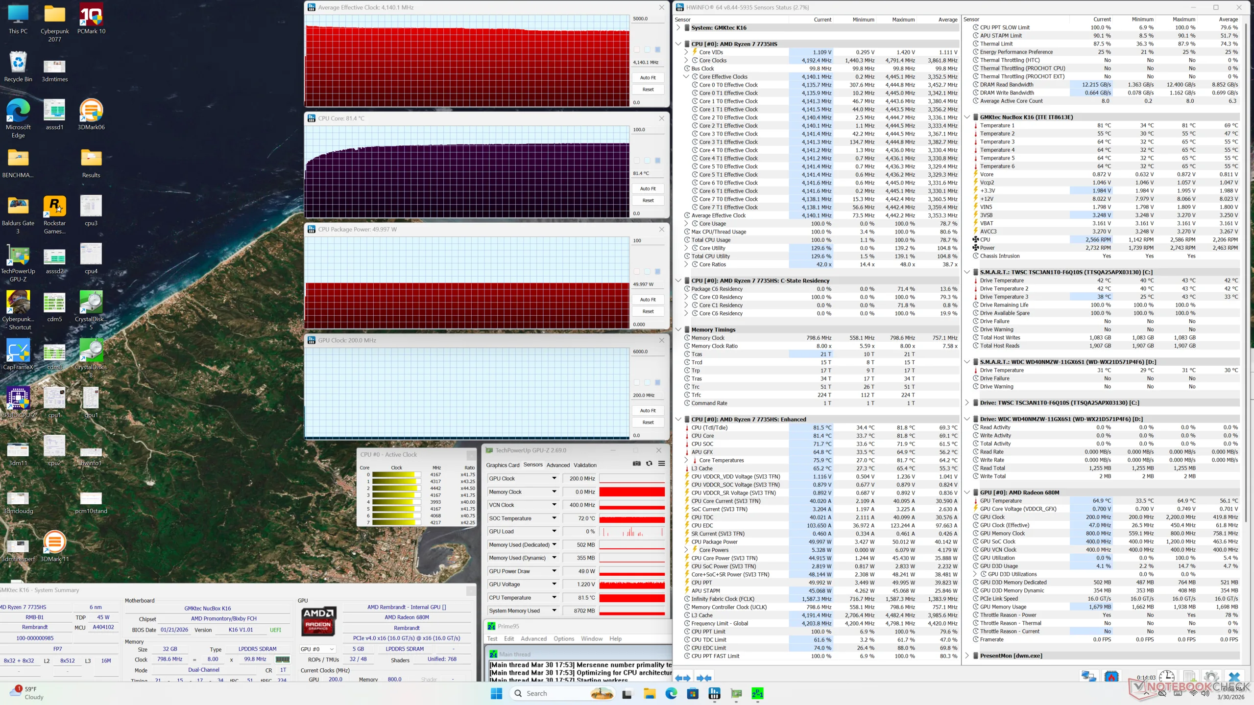 Processorn stabiliserades på 4,1 GHz, 50 W och 81 C när den körde Prime95-stress, vilket faktiskt är varmare än vad vi registrerade på EVO-X1 med den nyare och snabbare Zen 5-processorn. Kärntemperaturen fortsatte att vara några grader varmare även när vi körde spel. Den NucBox K13 med den mer effektiva Core Ultra 7 256V erbjuder både snabbare spelprestanda och en svalare driftstemperatur.