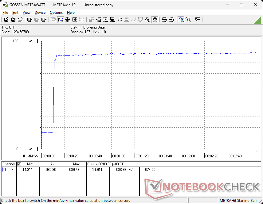 Vi kan registrera ett maximalt uttag på 90 W från den medelstora (13,2 x 5,8 x 3,2 cm) 120 W AC-adaptern när processorn är belastad till 100 procent.