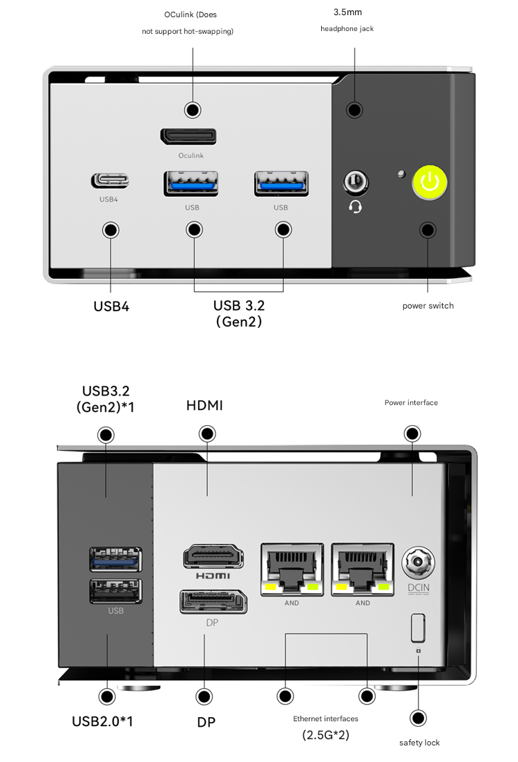 Det positiva är att GMK M8 har en OCuLink-port, vilket gör att användare kan koppla ihop minidatorn med en eGPU för bättre spelprestanda (GMKtec AD-GP1 kostar $469,79 på Amazon). Det finns också en USB4-port, som utökar eGPU-kompatibiliteten och ger möjlighet att ansluta höghastighetstillbehör till systemet. När det gäller de andra portarna är de som följer: