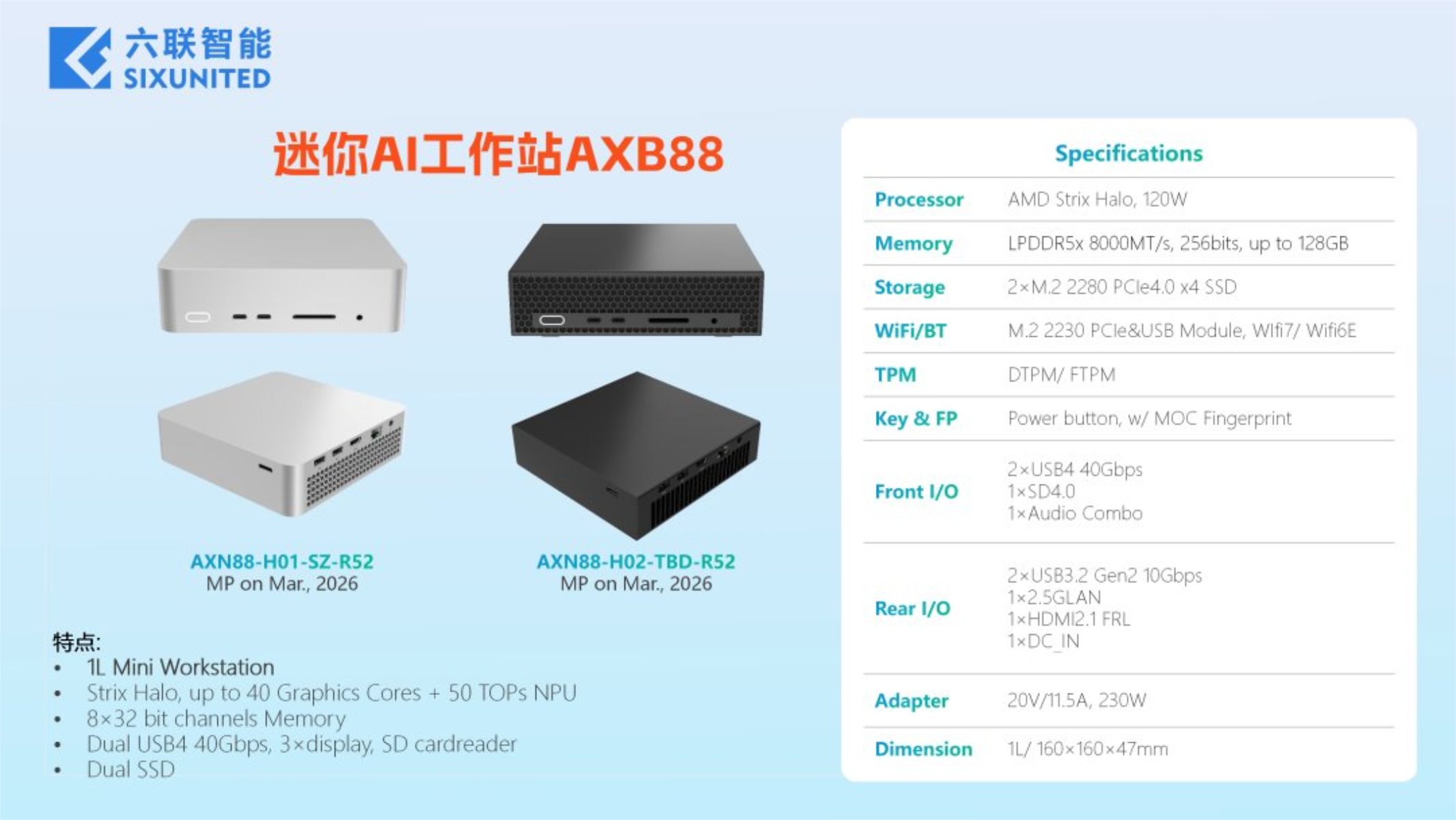 Samtidigt introducerade företaget också två mini-PC-datorer som stöds av samma arkitektur. Medan dessa hade 2-liters och 4-literslådorhävdar Sixunited att de har gått ännu mindre med Mini AI Workstation AXB88. Som grafiken nedan visar mäter AXB88 160 x 160 x 47 mm oavsett de två ytbehandlingarna som visas, vilket är mycket mindre än konkurrerande Strix Halo mini-PC:er som GMKtec EVO-X2 (för närvarande 1 699 USD på Amazon).