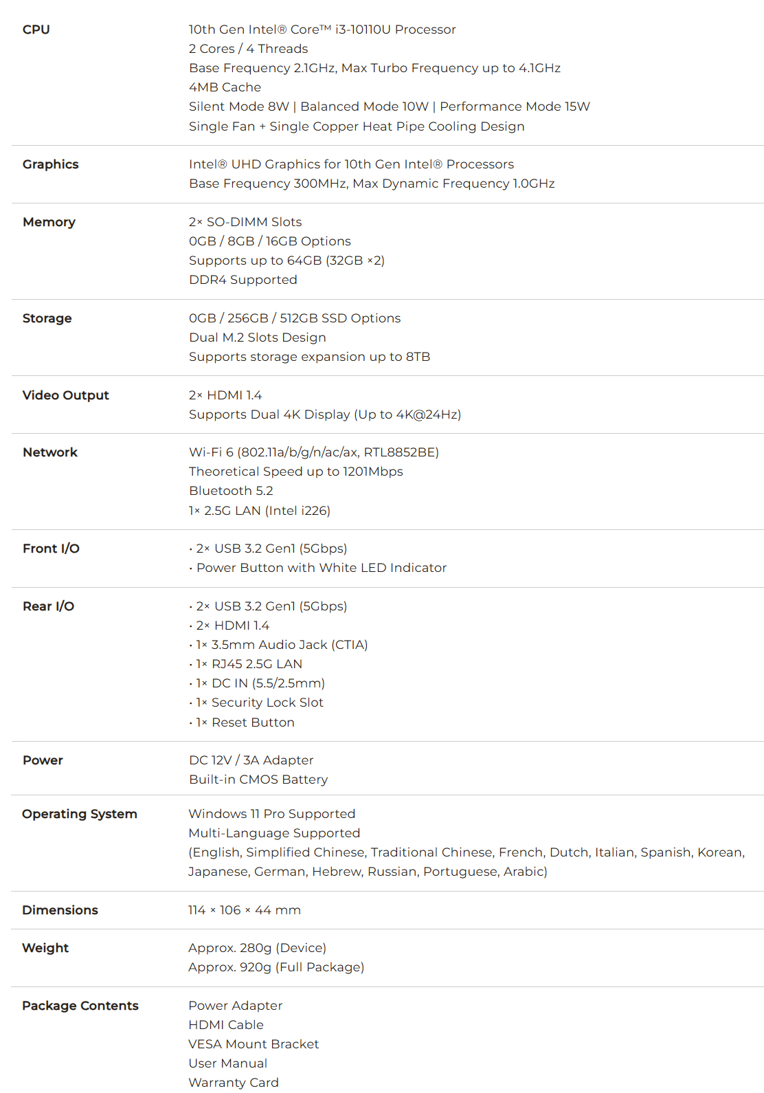 Utöver detta finns Bluetooth 5.2 och dual-band WiFi 6 för trådlös anslutning. NucBox G3 Pro har också en relativt kompakt formfaktor och stöd för VESA-montering. Kolla in det bifogade specifikationsbladet nedan för att lära dig mer om mini-PC:n.