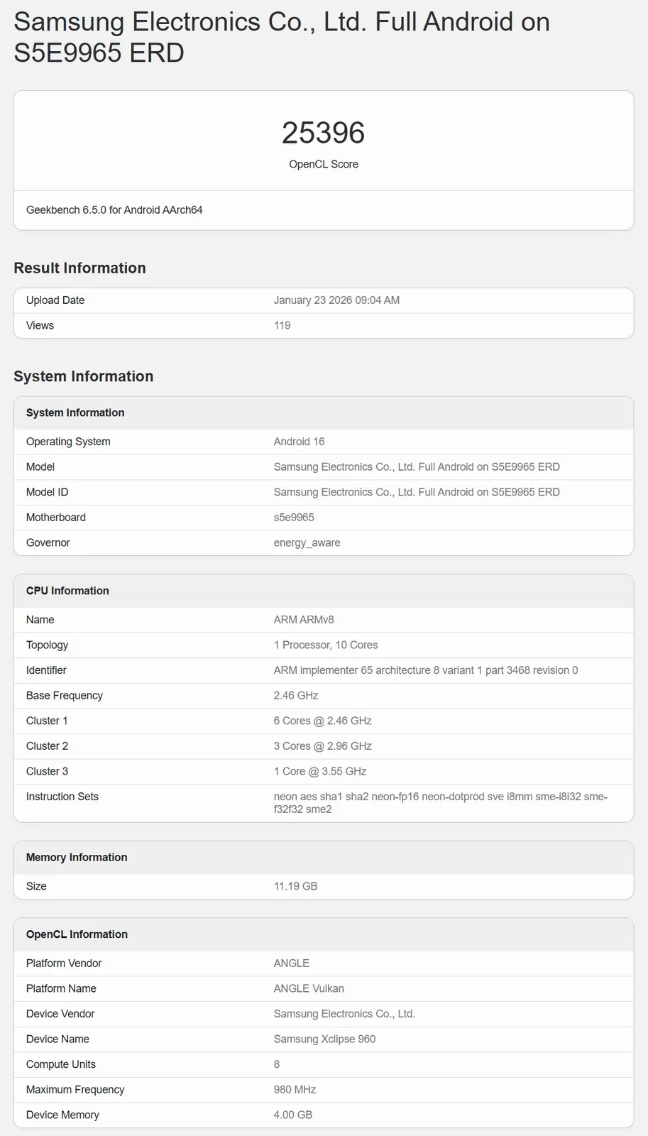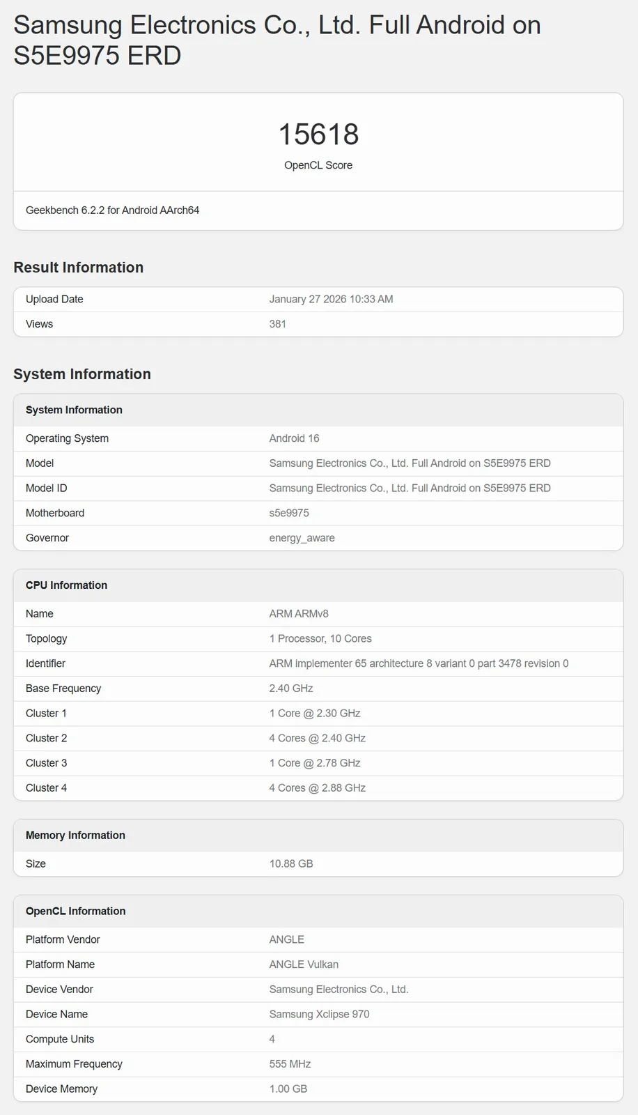 Om modellen med numret S5E9975 ERD verkligen är ett Samsung testsystem för efterföljaren till Exynos 2600presterar den för närvarande mycket dåligt. GPU-prestandan mättes här, som, som förväntat, är en Samsung Xclipse 970 och enligt Geekbench är utrustad med 4 beräkningsenheter med en klockhastighet på 555 MHz. Det är ungefär hälften så mycket och hälften så snabbt som testsystemet Exynos 2600, som redan har gjort sitt -märke på Geekbench flera gånger. Med tanke på att GPU:n bara är ungefär hälften så kraftfull är resultatet på 15 618 poäng i OpenCL-testet inte så illa, men naturligtvis fortfarande betydligt under nivån för testsystemet Exynos 2600