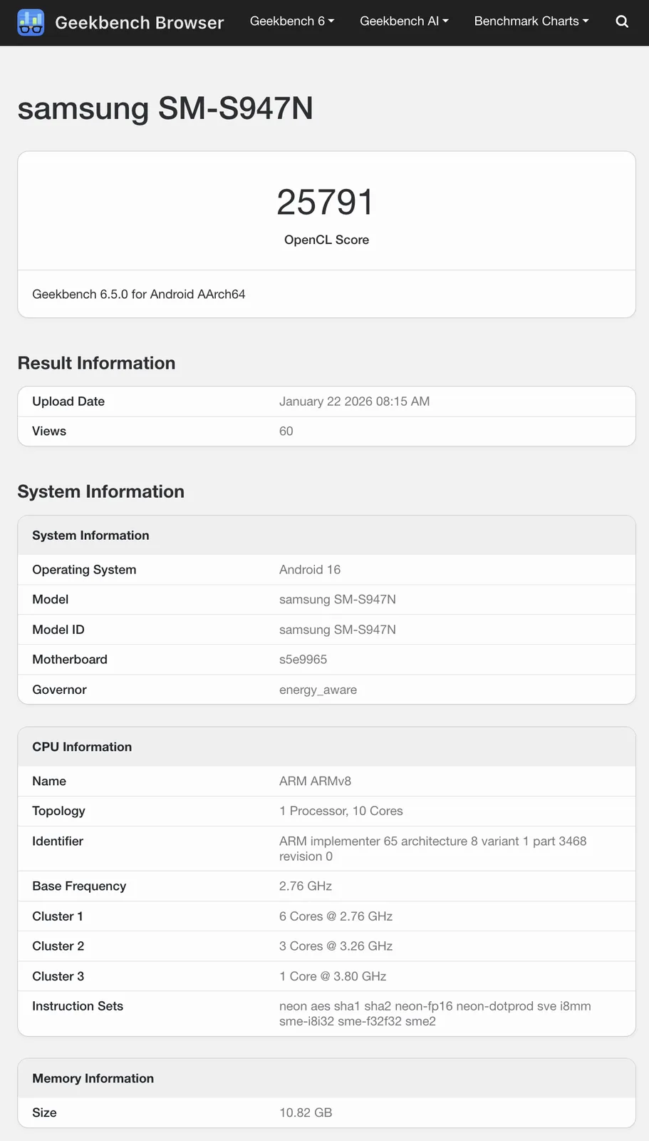 Oavsett vilket, Exynos 2600 inuti Galaxy S26 Plus här överträffar jämförbara riktmärken för Galaxy S26. Med poäng på 24 964 och 25 791 placerar sig Exynos 2600 och dess Xclipse 960 GPU på Snapdragon 8 Elite Gen 5 nivåer i Geekbench 6 OpenCL-riktmärkena. Huruvida detta översätts till verklig prestanda kommer att förbli okänt tills oberoende recensioner börjar anlända i slutet av februari eller början av mars.