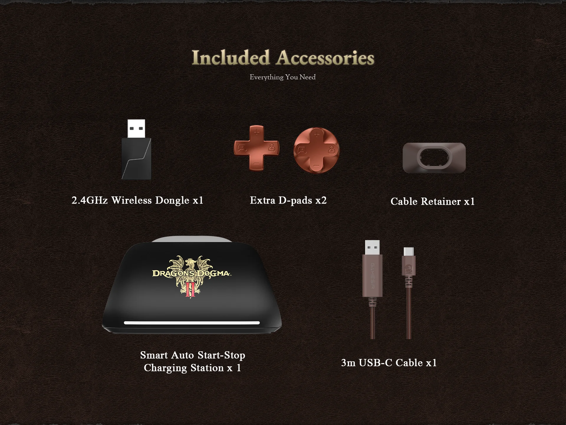 Tillsammans med handkontrollen och laddningsdockan får köparen även en 2,4 GHz trådlös dongel, två extra D-Pads i olika design, en kabelhållare och en 3 m lång flätad USB-C till USB-A-kabel.