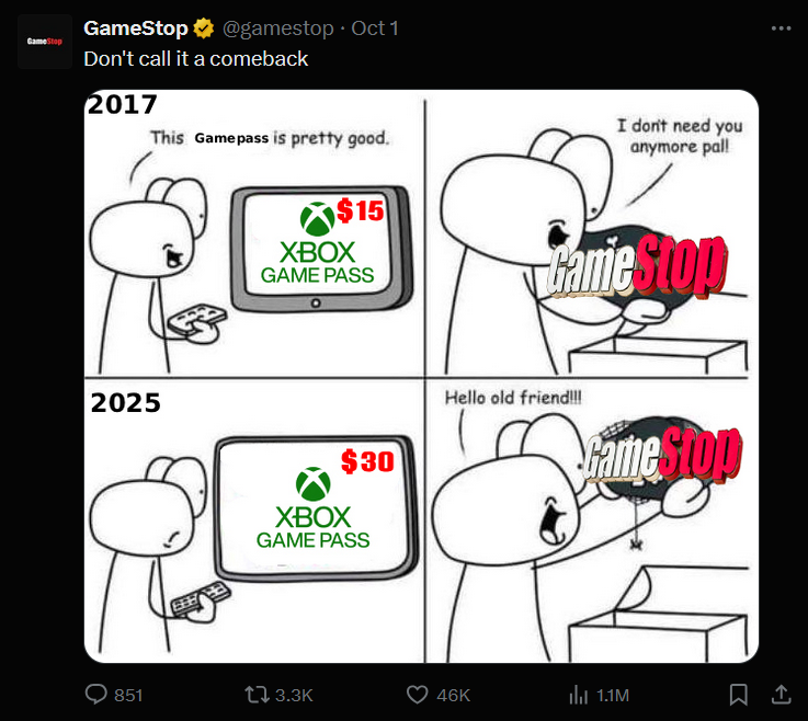GameStops sociala medieteam slösade ingen tid alls, släppa memes på X hånar prishöjningen samtidigt som de påpekar att dess 19,99 $ Game Pass Ultimate-kort fortfarande finns tillgängliga i butiken och online. GameStops trolling av Microsoft, samtidigt som de marknadsför sina egna kort, kan krita upp som ganska effektiv marknadsföring vid en tidpunkt då människor är extremt vokala om prisförändringen.