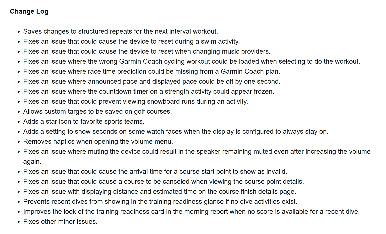 Betaversion 16.14 fokuserar på förbättringar och buggfixar för dessa nyare Forerunner-smartklockor. I versionsinformationen står det att dina favoritsportlag nu är markerade med en stjärnikon, och det finns en ny inställning som gör det möjligt för användare att visa sekunder på vissa urtavlor som alltid är på. För dykare har utseendet på avsnittet om träningsberedskap i morgonrapporten förbättrats när det inte finns någon ny dykpoäng. Dessutom kan golfare nu spara anpassade mål på golfbanor.