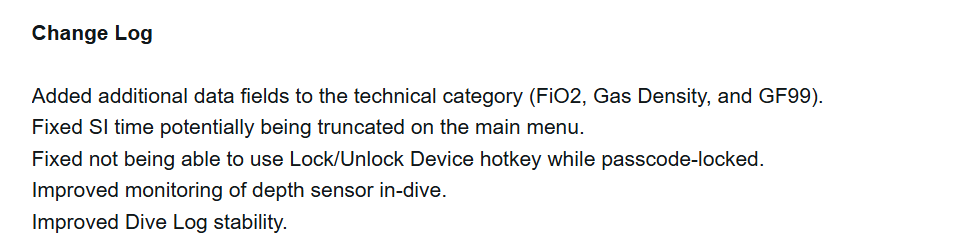 Garmin har åtgärdat ett problem med SI-tiden (Surface Interval), som kunde förkortas i huvudmenyn. Dessutom har man löst ett problem där användare inte kunde använda snabbtangenten för att låsa eller låsa upp enheten när den var låst med en lösenkod. Denna version levereras också med Garmin Connect Mobile-översättningar version 2.05, även om fördelarna med denna uppgradering är oklara.