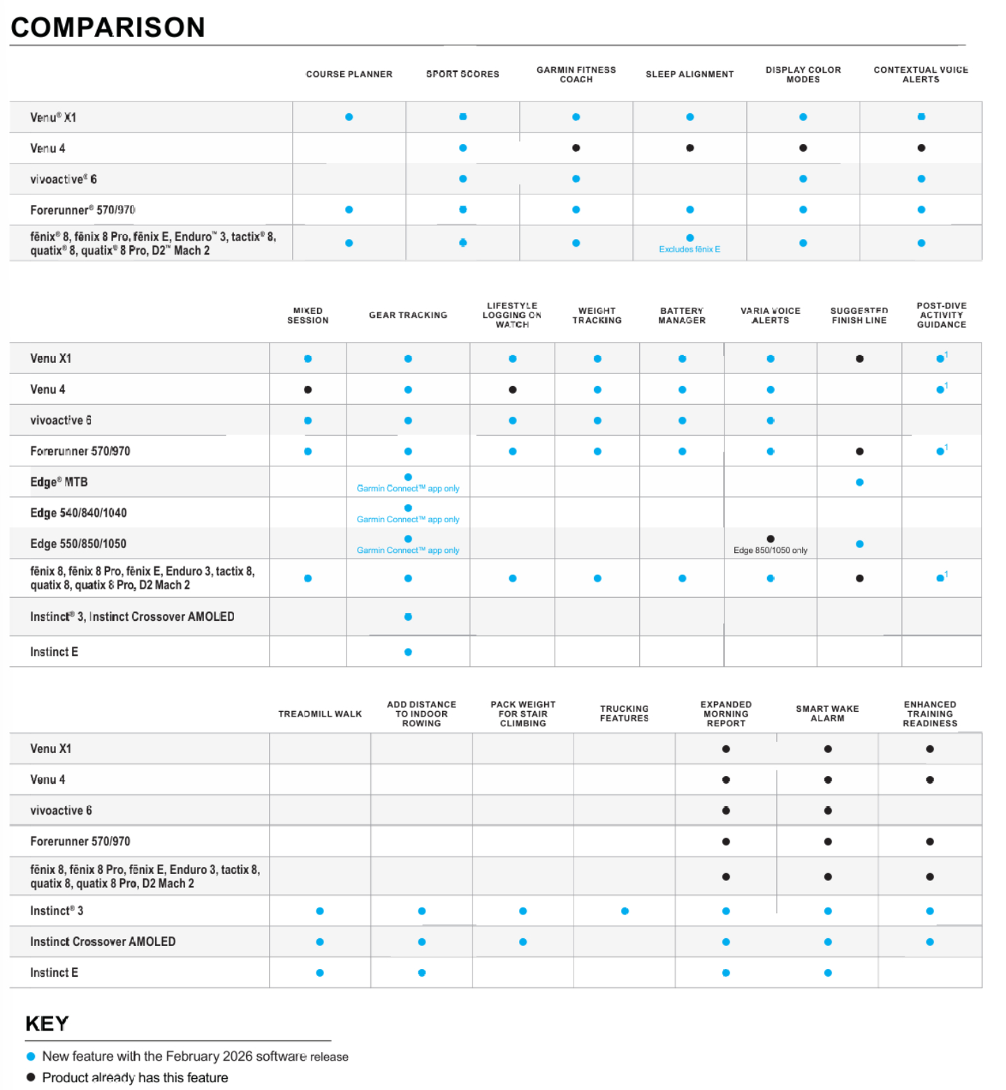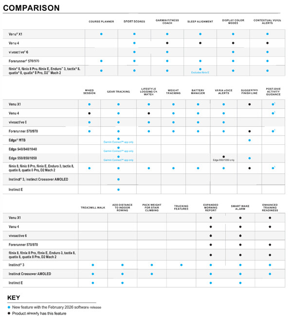 Jämförelsetabellen visar dock att andra nya funktioner också är på väg, inklusive Battery Manager och Expanded Morning Report för Instinct 3-serien. Garmin kommer att introducera dessa nya funktioner gradvis och har inte satt någon fast tidslinje för när utrullningen av funktionsuppdateringen i februari 2026 kommer att avslutas. Se bilderna ovan och nedan för mer information.