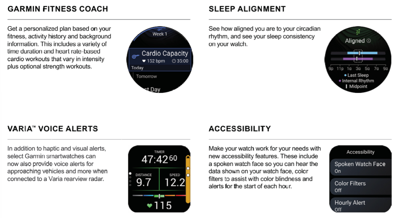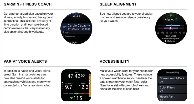 Garmin fokuserar på sju nya funktioner med sin senaste funktionsuppdatering. Till exempel kommer Garmin Fitness Coach att utvidgas till fler smartklockor efter att ha debuterat på Venu 4 (curr. 549 $ på Amazon). Andra förbättringar inkluderar Varia Voice Alerts, Sport Scores och en Course Planner-funktion. Garmin har också lagt till möjligheten att se hur anpassad du är till din dygnsrytm genom något som kallas Sleep Alignment.