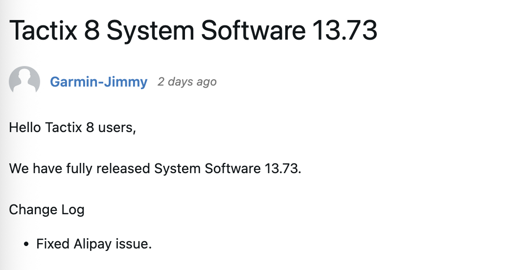 På andra enheter kan man vanligtvis kontrollera direkt vilka förbättringar en ny uppdatering har gjort. Av någon anledning beslutar Garmin att inte visa en changelog varken på själva smartklockan eller på Connect Mobile-appen. Istället publicerar den dessa på sina forum, vilket den äntligen har gjort med System Software 13.37. Som det visar sig löser den nya uppdateringen bara en icke avslöjad bugg som förhindrade att Alipay fungerade korrekt. Således verkar det som om Garmin planerar att vänta några veckor till innan de levererar en väsentlig uppdatering till sina senaste avancerade smartklockor.