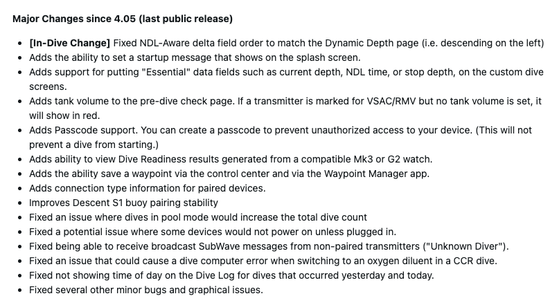 Med systemprogramvaran 5.09 blir Descent X50i den senaste bärbara enheten från Garmin som får lösenordsverktyget. Denna säkerhetsfunktion började rulla ut till användare i början av 2025. Företaget noterar att det inte kommer att förhindra att ett dyk startar. En annan förändring är tillägget av information om anslutningstyp för parade enheter. Dessutom är parningsstabiliteten för Descent S1 boj(för närvarande 2 080 USD på Amazon Marketplace) sägs ha förbättrats.
