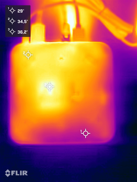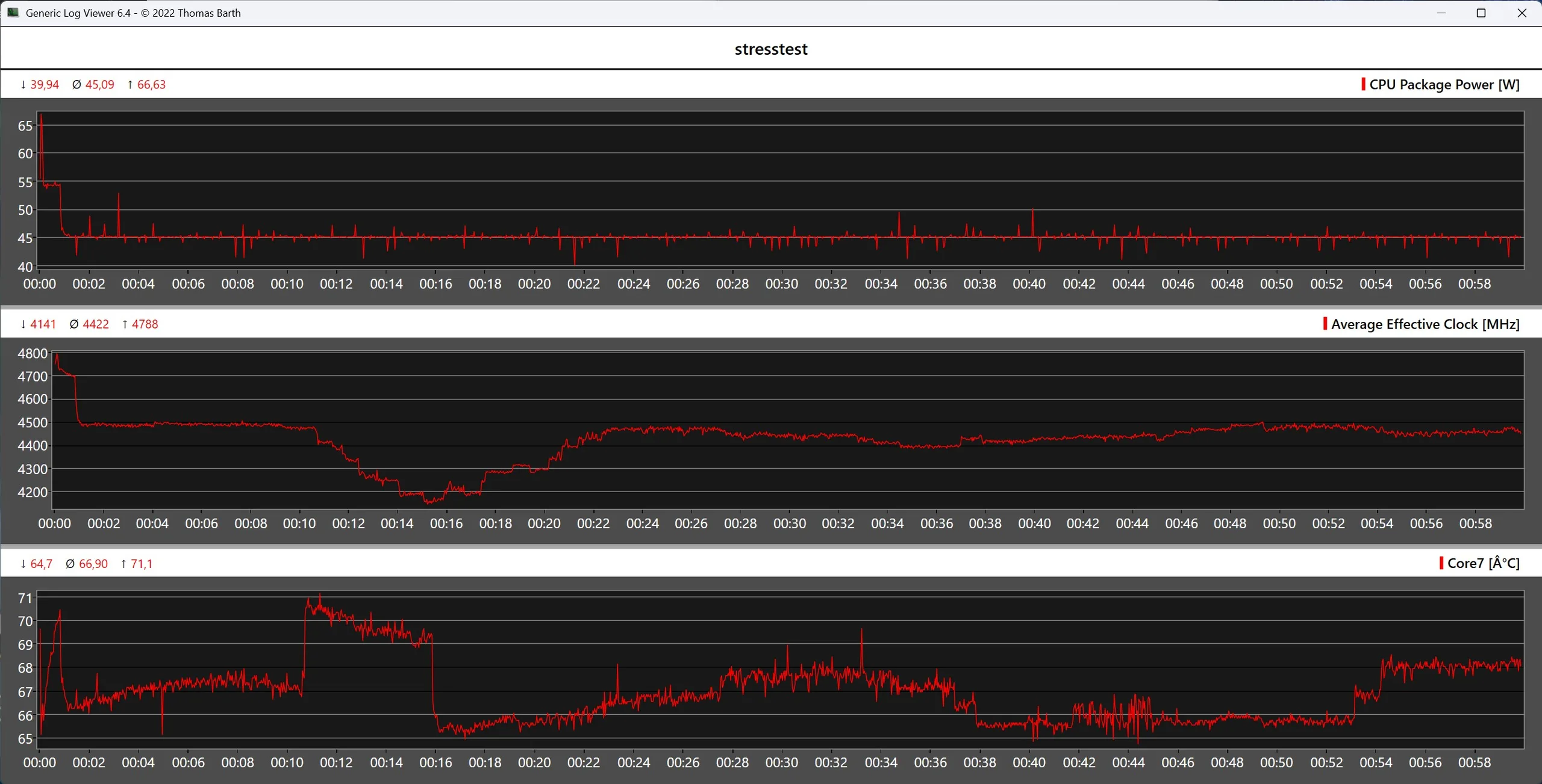 Höljet på Geekom A7 Max förblir behagligt svalt både i viloläge och under belastning. I stresstestet når den installerade AMD Ryzen 9 7940HS kortvarigt temperaturer på cirka 71 °C, vilket inte är kritiskt. Kylsystemet kan på ett tillförlitligt sätt avleda den permanent applicerade TDP på 45 watt.