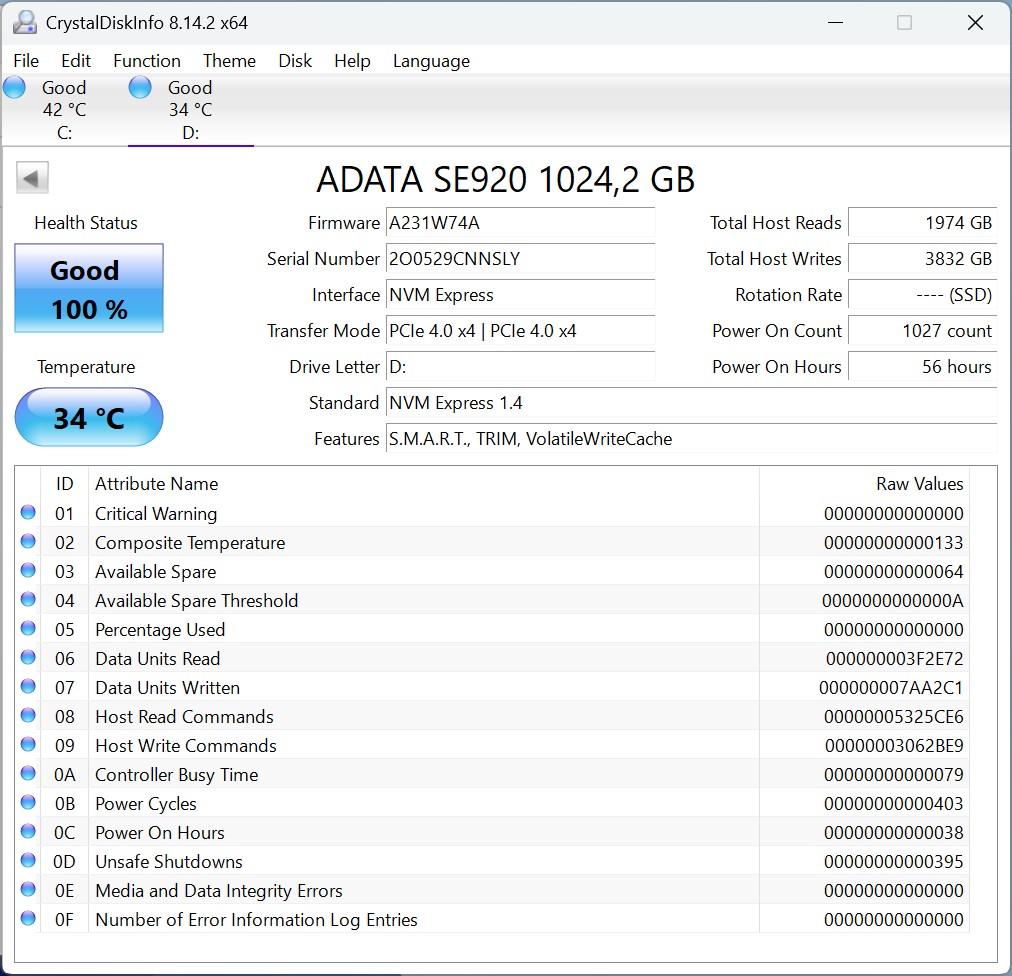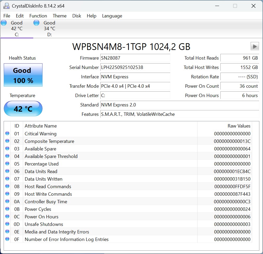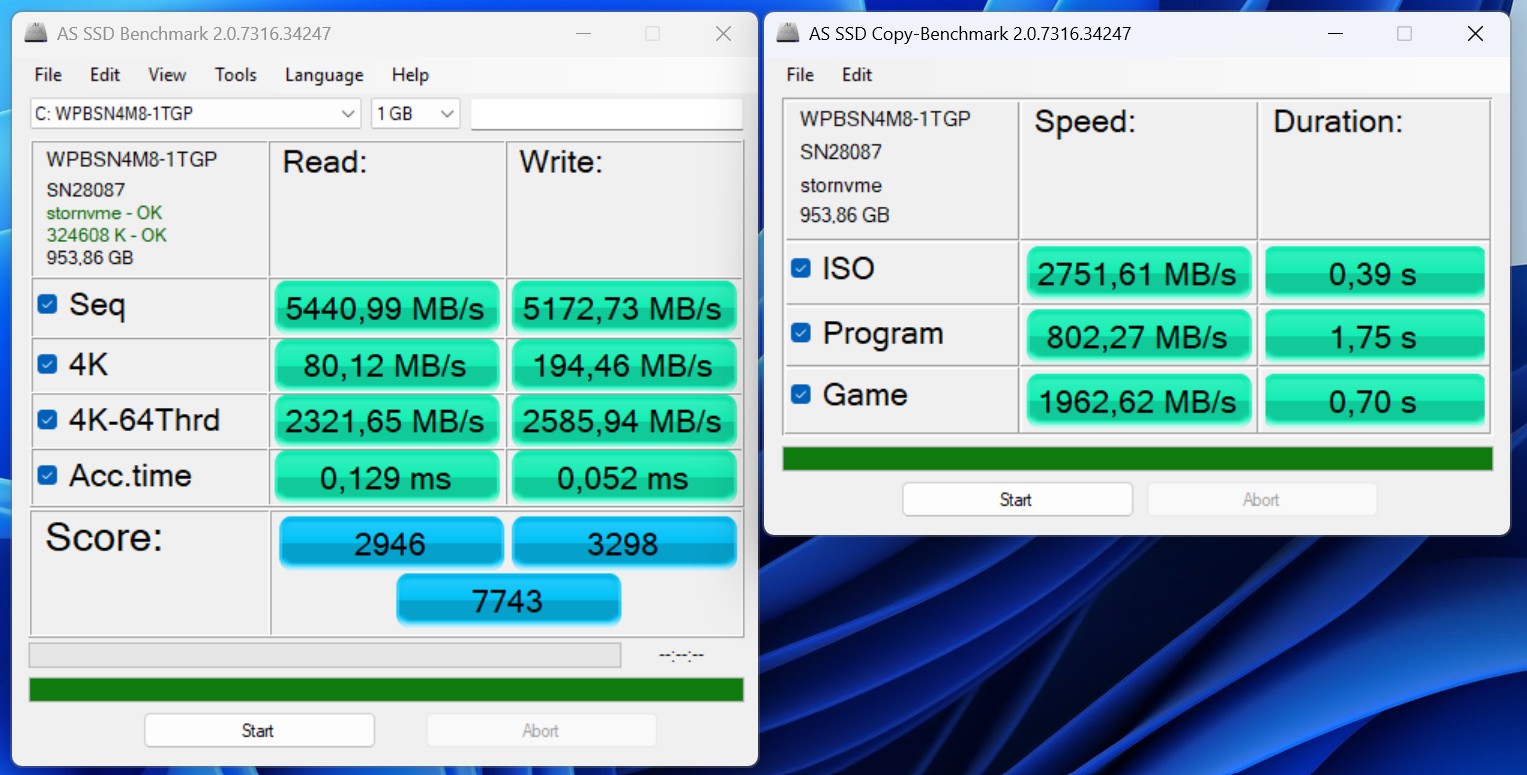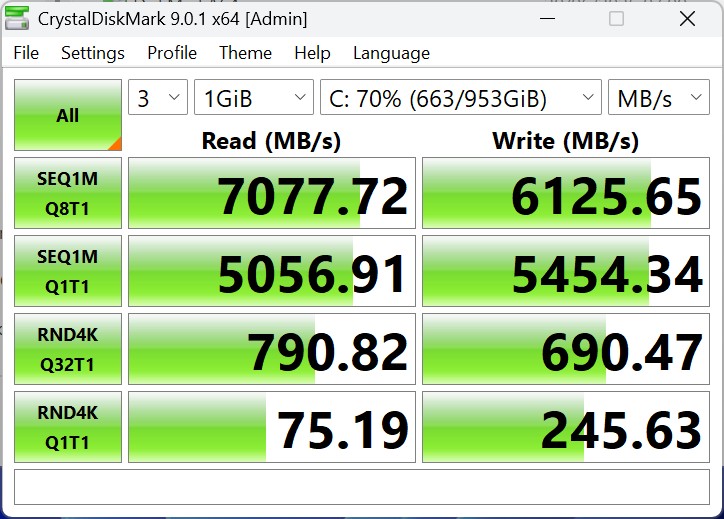 Geekom A7 Max använder en 1 TB SSD med en PCIe 4.0-anslutning, som uppnår anständiga, om än inte enastående, överföringshastigheter. För vardagliga uppgifter och produktiva arbetsbelastningar är dock lagringsprestandan som erbjuds lätt tillräcklig. Kylningen av enheten är utformad på ett sådant sätt att prestandan förblir stabil även under långvarig belastning.