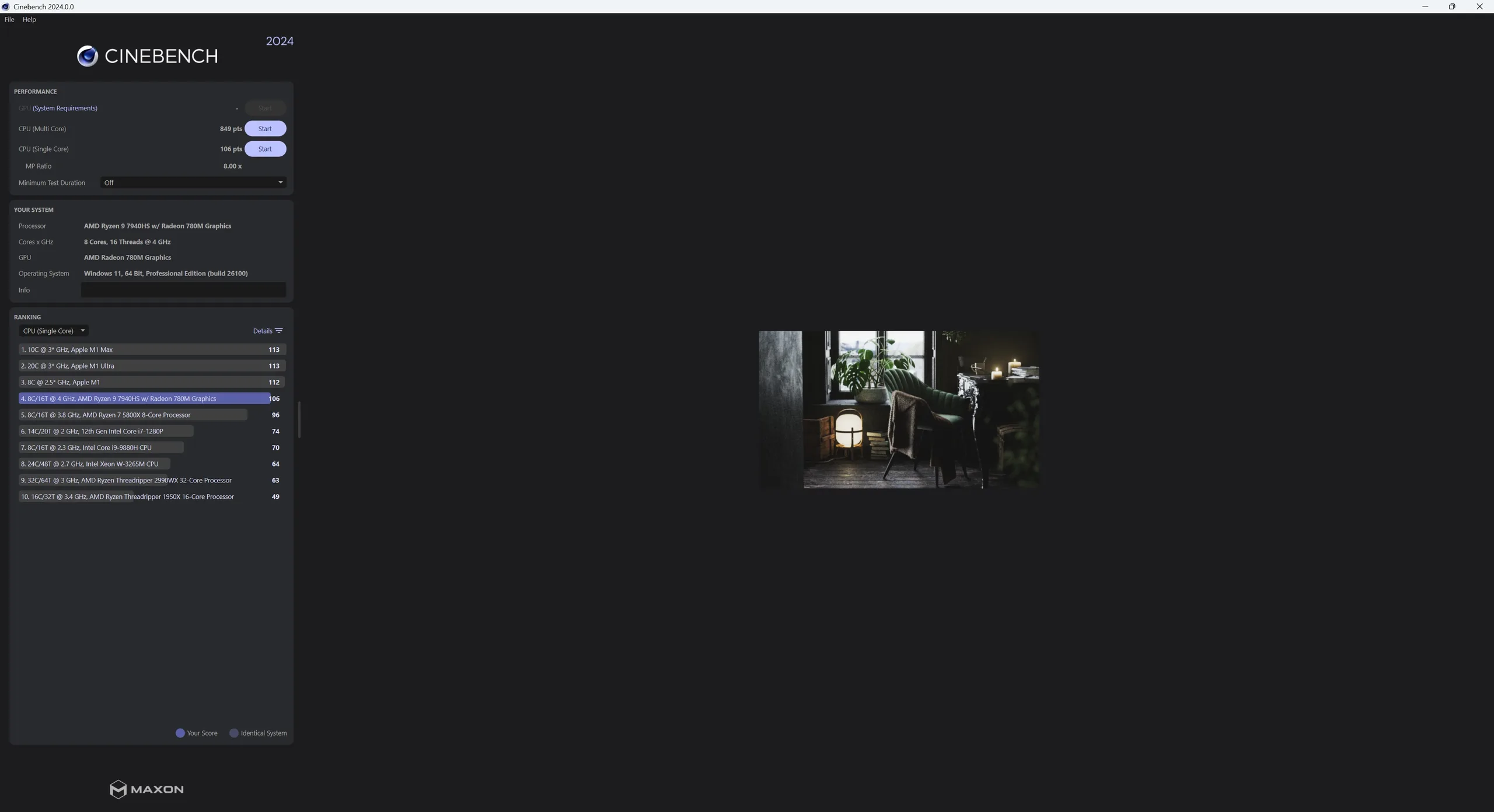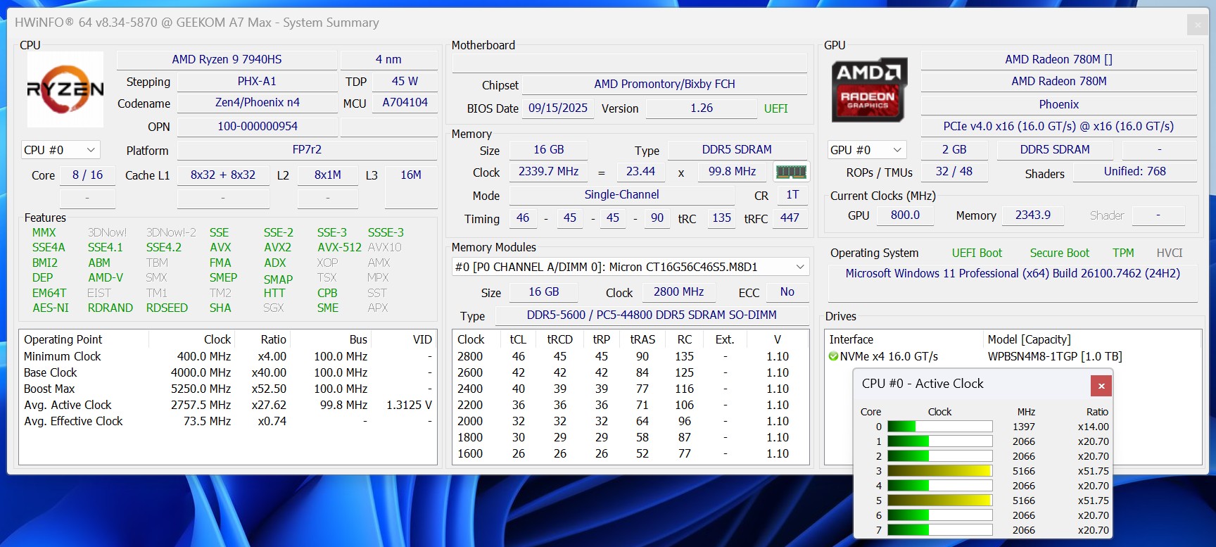 Geekom A7 Max med AMD Ryzen 9 7940HS (Zen 4, 8 kärnor, 16 trådar) levererar en solid övergripande prestanda och är placerad i det breda mellanområdet av nuvarande minidatorer. SoC:n kan kortvarigt förbruka upp till 65 watt, men under ihållande belastning stabiliseras förbrukningen på cirka 45 watt. Trots att processorn inte längre är helt ny visar A7 Max att övertygande prestanda fortfarande är möjligt flera år efter marknadsintroduktionen.