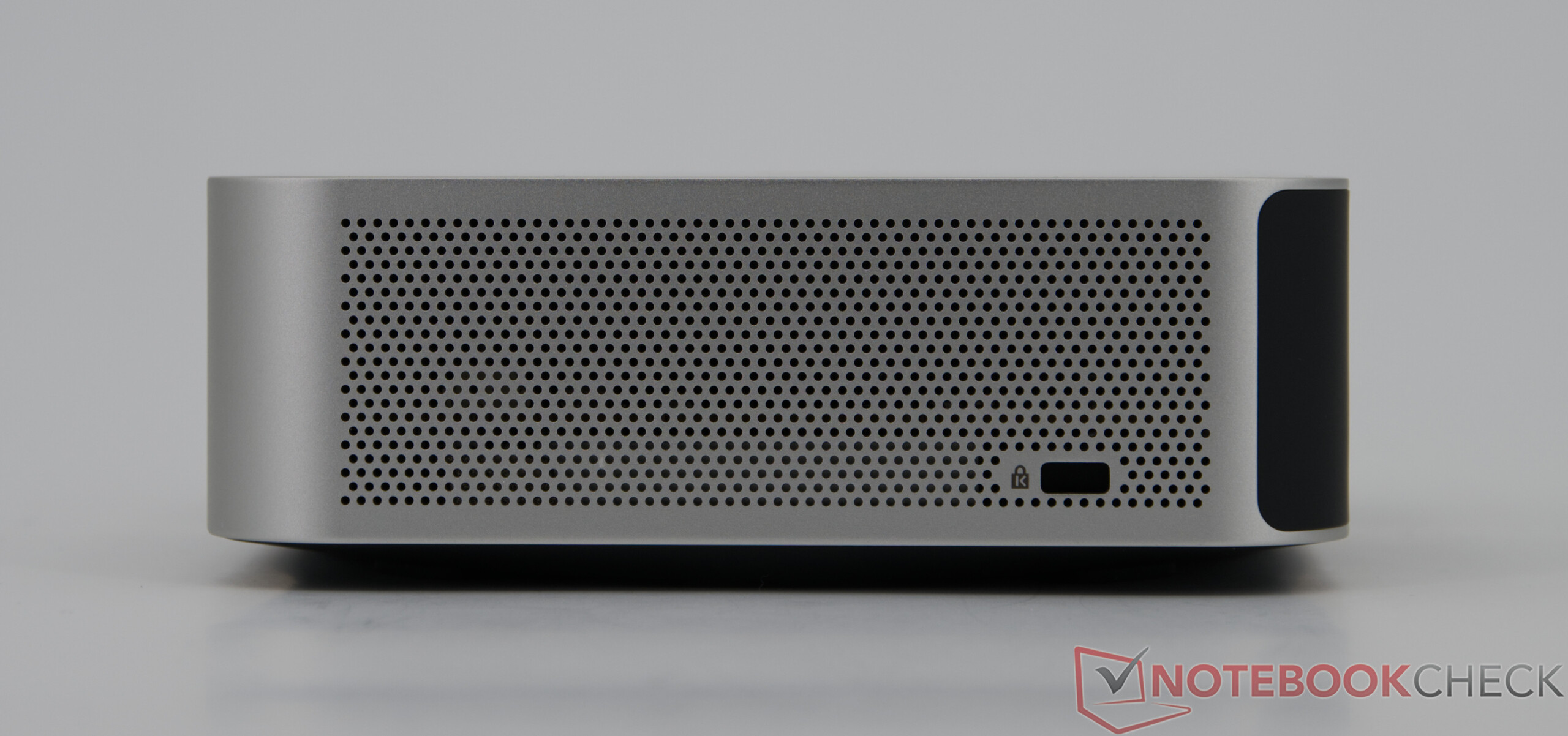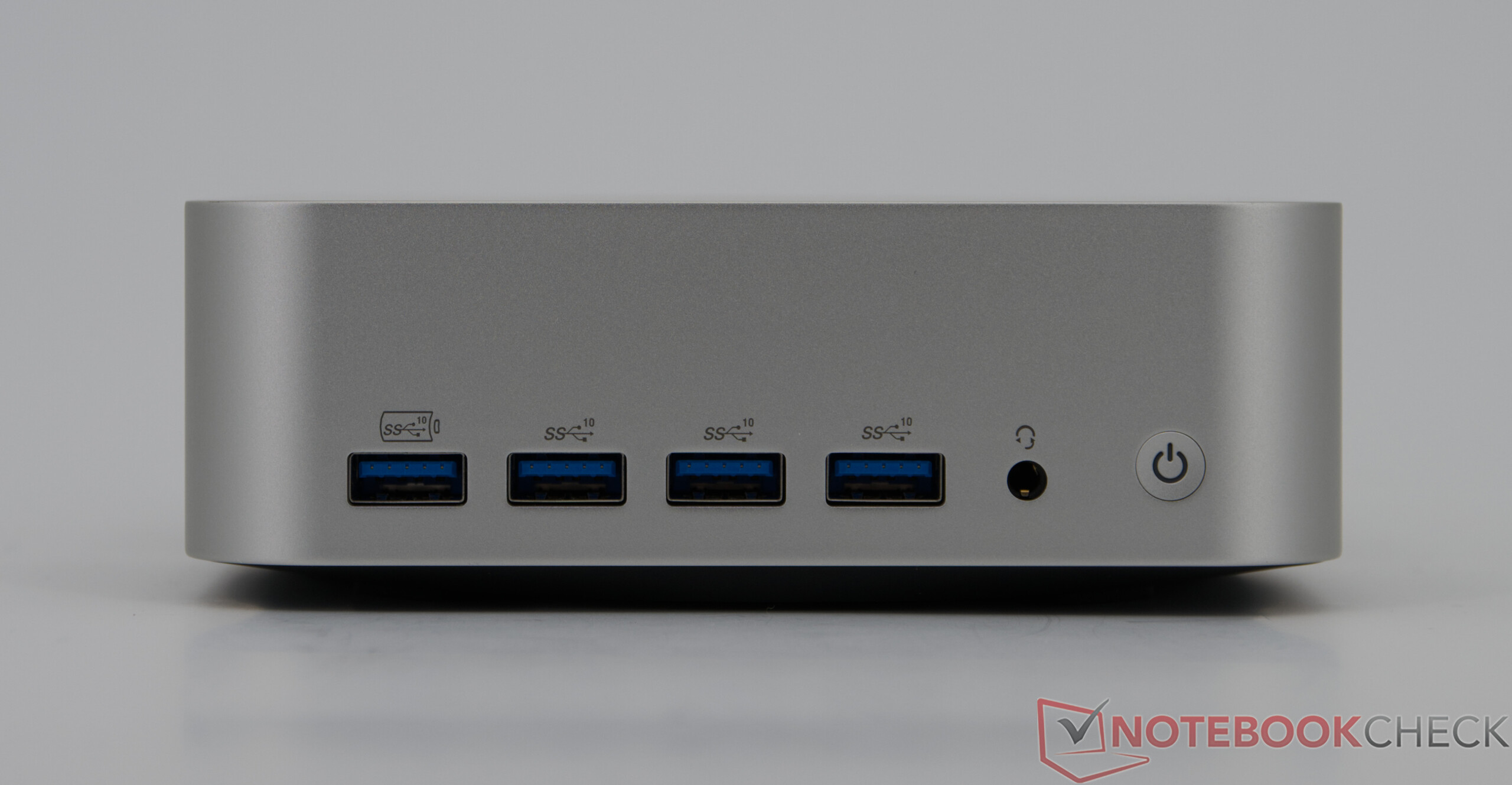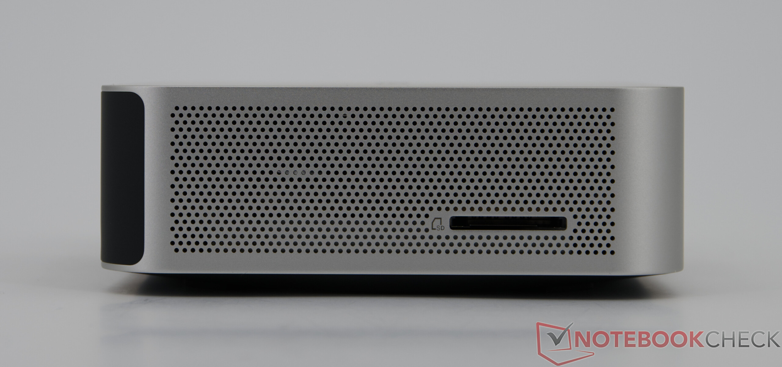 Det generöst tilltagna höljet möjliggör ett omfattande utbud av anslutningar: totalt sex USB-A-portar finns tillgängliga, varav fyra på framsidan, kompletterat med två USB4-portar på baksidan och två HDMI-utgångar. Detta gör att upp till fyra bildskärmar kan användas samtidigt. En snabb SD-kortläsare på sidan kompletterar utrustningen, medan USB4 möjliggör höga datahastigheter, vilket externa SSD-enheter visar på ett imponerande sätt.