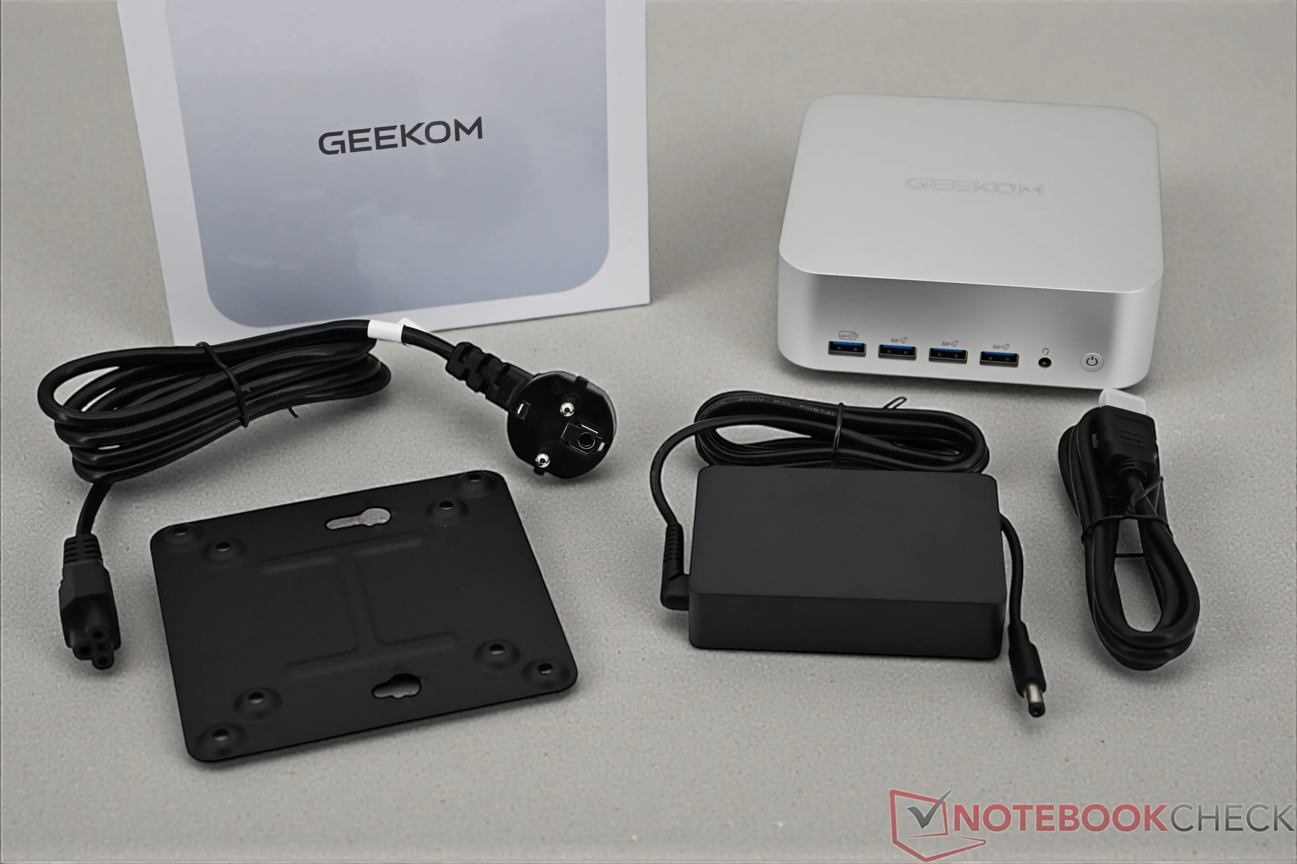 Geekom A7 Max använder samma större hölje som A8 Max eller A9 Max, vilket tydligt skiljer den från tidigare modeller. Ändå har Geekom valt det ofta använda aluminiumhöljet, vilket innebär att alla fördelar och nackdelar förblir desamma. Utförandet är av hög kvalitet och motsvarar prisklassen. Med en vikt på ca 681 gram är Mini-PC:n trots sin storlek fortfarande lättare än vissa konkurrerande modeller, och det kompakta nätaggregatet på 256 gram märks knappt.