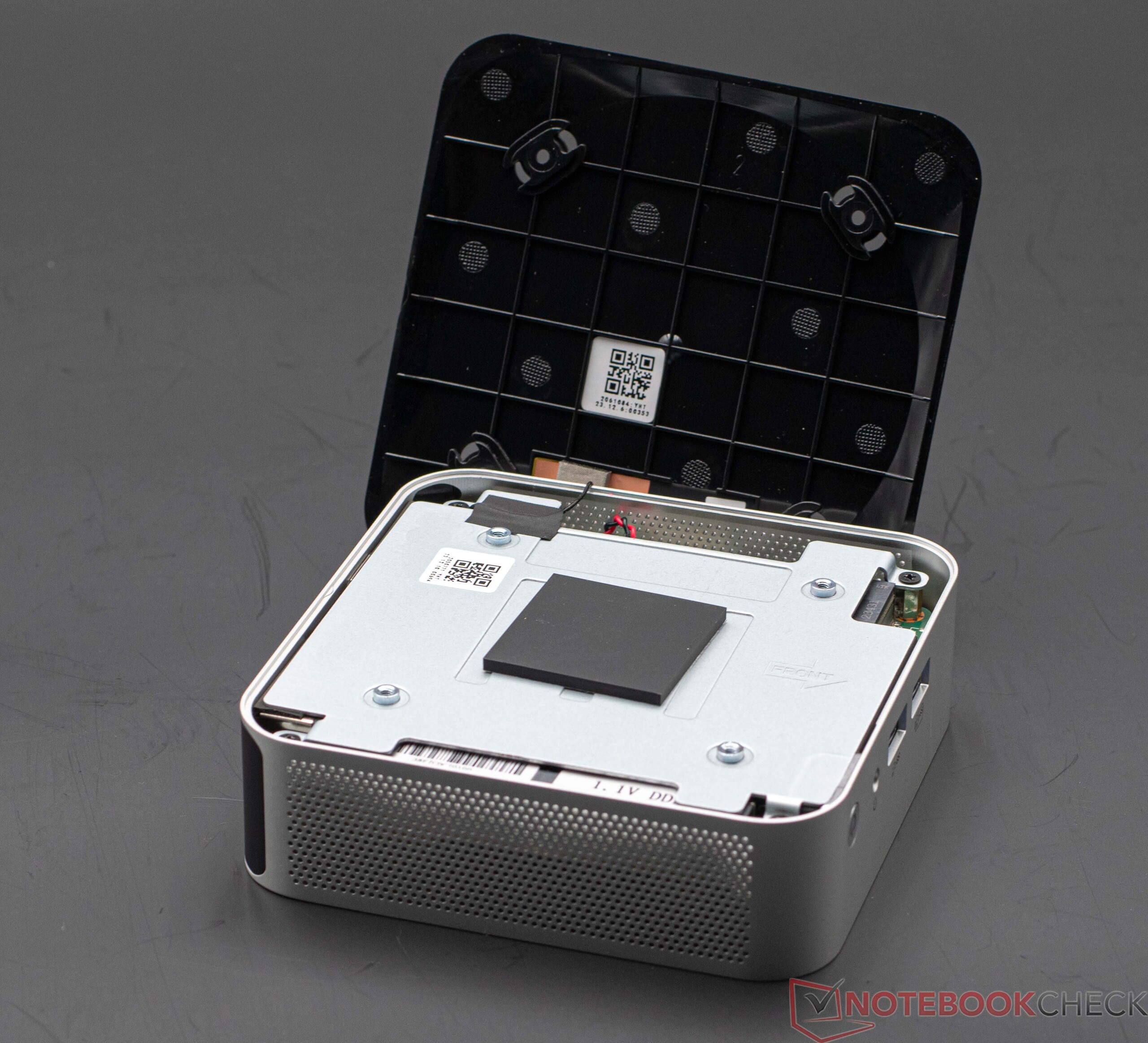 Tack vare den extremt kompakta designen hålls allt underhållsarbete till ett minimum. Dessutom levereras Geekom A7 alltid förkonfigurerad med RAM och SSD. Men om du vill byta ut RAM-minnet eller masslagringen kan du fortfarande göra det, eftersom komponenterna är avtagbara. Skruvarna på undersidan är dolda under de limmade gummifötterna. Som så ofta finns det en risk att gummifötterna inte längre sitter fast ordentligt efter borttagningen. När de fyra skruvarna har lossats kan bottenplattan enkelt tas bort. Du bör dock fortfarande vara försiktig, eftersom WLAN-antennkabeln inte erbjuder mycket utrymme för manövrering. De installerade komponenterna kan sedan lätt nås under en annan metallplatta. Bland annat kan WLAN-modulen också bytas ut vid behov. Hela kretskortet, inklusive kylenheten, måste tas bort för att rengöra CPU-fläkten. Denna är i sin tur fastsatt i höljet med fyra skruvar. Att ta bort kretskortet är mycket enkelt och kan göras utan specialverktyg.