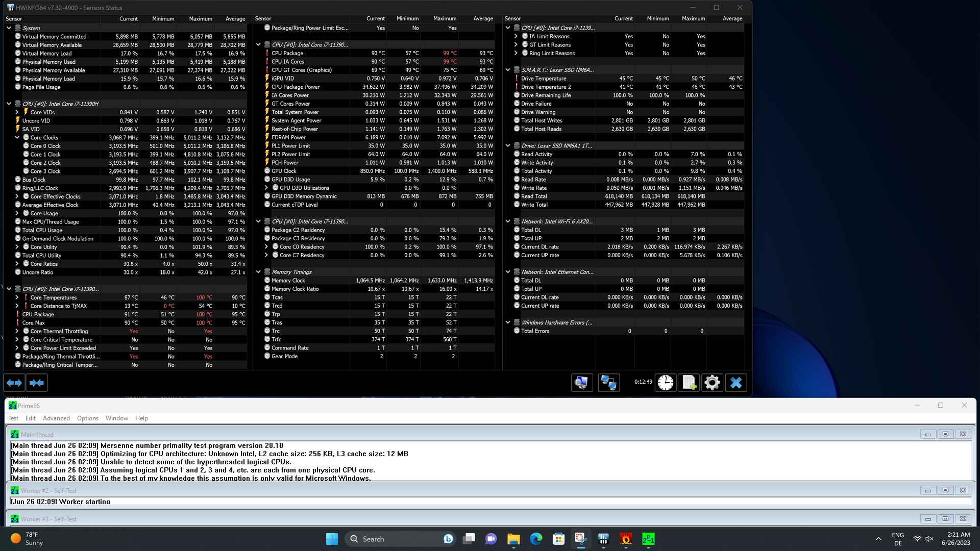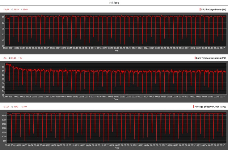 Cinebench R15 kontinuerliga loop ger oss en första titt på den installerade kylarens effektivitet i kombination med SoC:s effektmål. Vi såg att datorn inte presterade bättre i början av detta test än vad den gjorde under resten av testets varaktighet. Telemetridata under testet visade oss att dess maximala temperatur nåddes mycket snabbt. Vi vill dock nämna en positiv aspekt: DenIntel Core i7-11390Hpresterade konsekvent och de tidigare nämnda höga CPU-temperaturerna orsakade inte några som helst prestandaförluster.