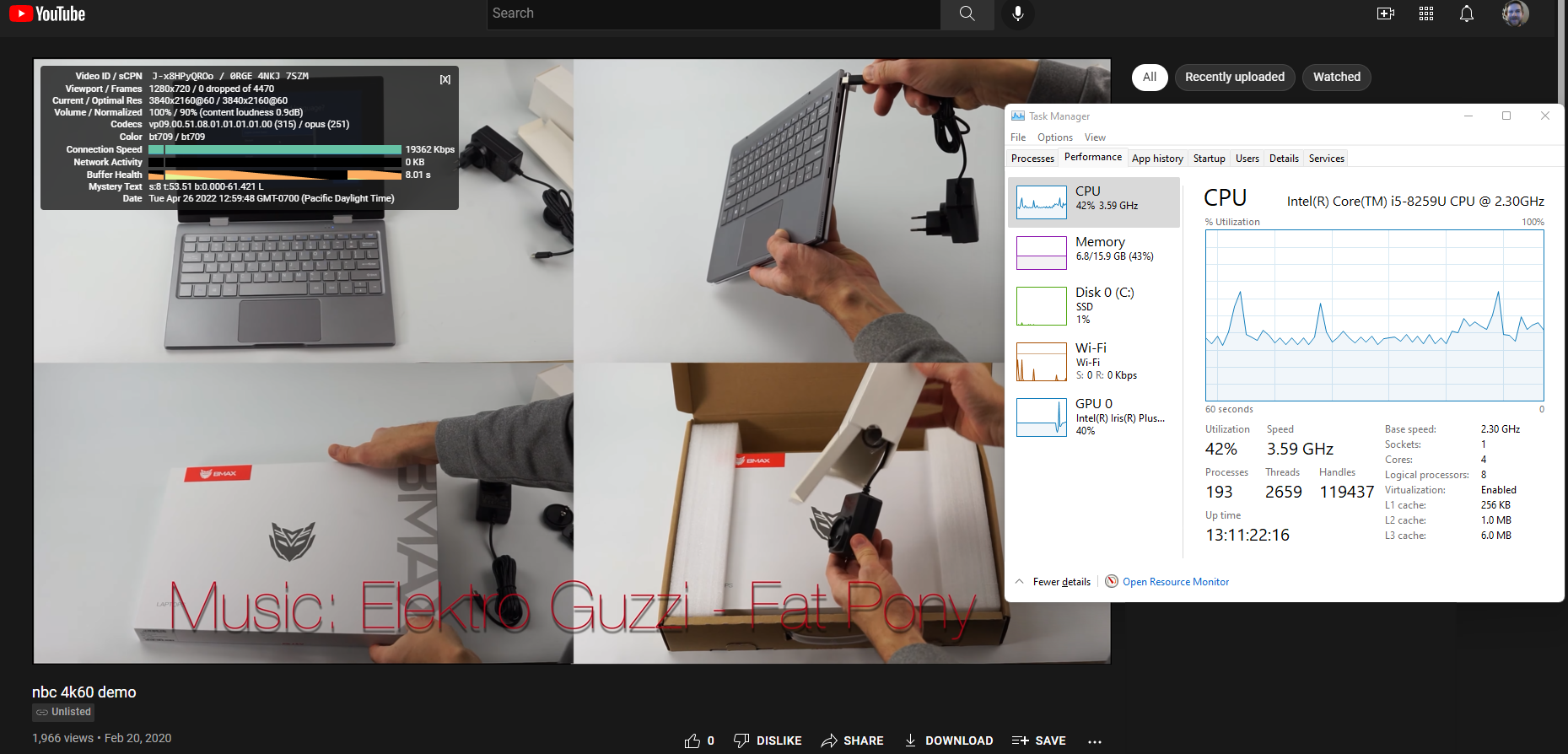 Den allmänna systemprestandan är tillräcklig för de flesta uppgifter. Geekom Mini IT8 ligger visserligen efter enheter med nyare chipset, men har tillräckligt med kraft för flitigt surfande på webben och för avancerade kontorsuppgifter. Om du kör flera CPU-intensiva uppgifter (t.ex. kör formler i flera stora kalkylblad samtidigt) kan det dock leda till vissa avmattningar. Geekom desktop släpar märkbart efter när det gäller skapande av digitalt innehåll, vilket troligen beror på dess svagare Intel Iris Plus Graphics 655 iGPU.
