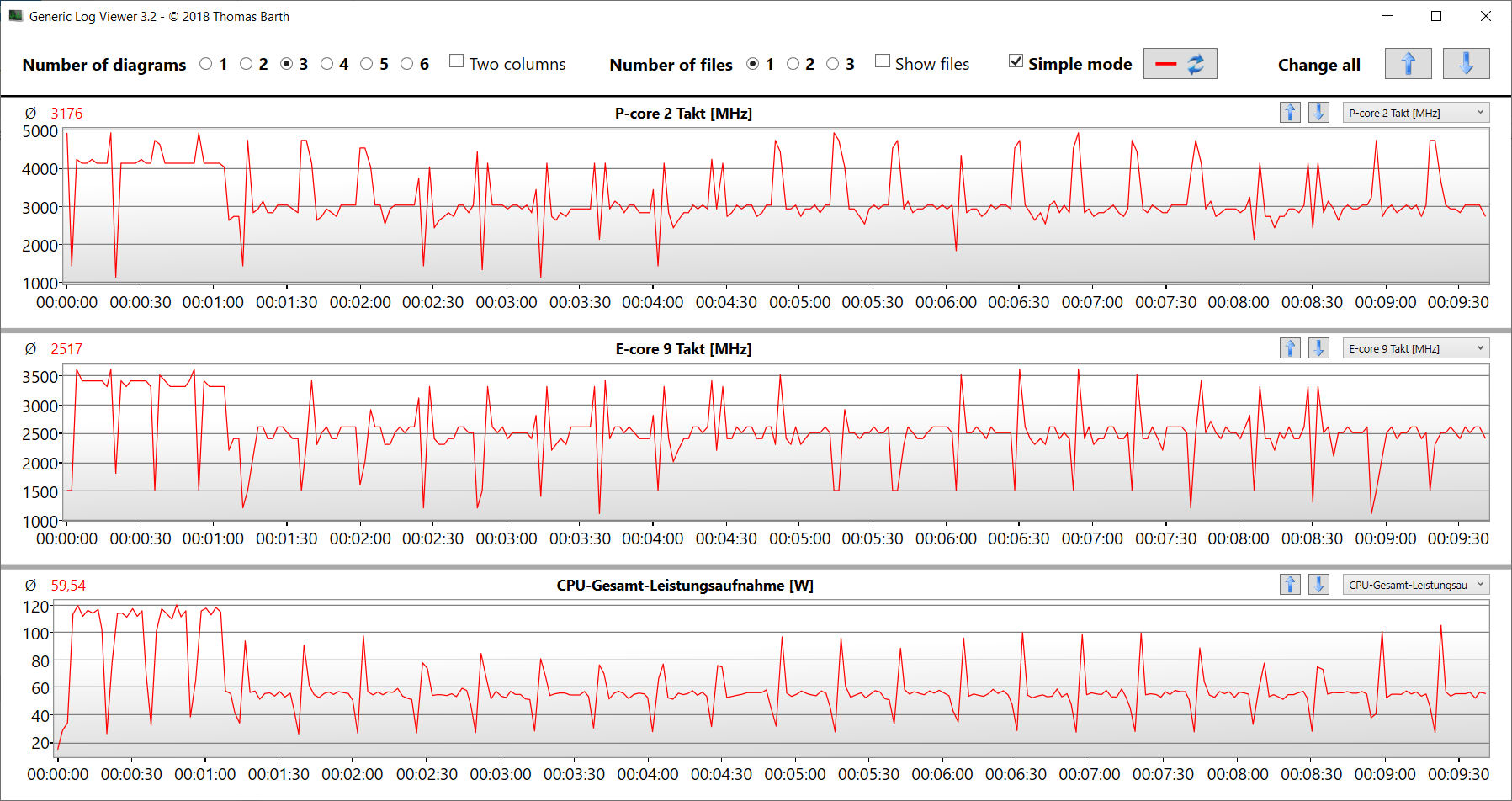 De 14 CPU-kärnorna i Core i7-13650HX (6P+8E) når en maximal klockfrekvens på 4,9 GHz (P) och 3,6 GHz (E). Kontinuerlig belastning med flera trådar (Cinebench R15 multi-core loop) gör att klockfrekvensen sjunker från den fjärde till den femte körningen. Därefter bibehålls en ganska konstant nivå. Performance-läget säkerställer permanent högre värden.