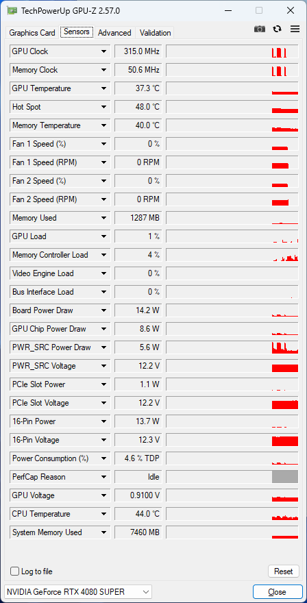 Vid körning av Den Witcher 3 i 1080p Ultra lyckas RTX 4080 Super Gaming OC hålla en stadig klockfrekvens på 2 760 MHz vid 100 % PT och förbrukar 254 W.