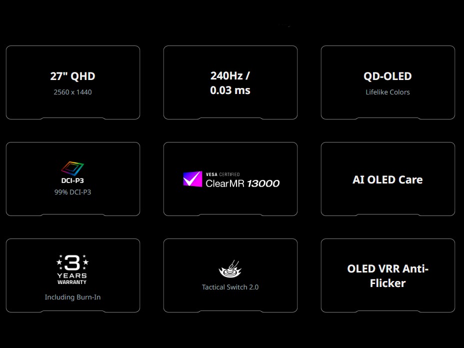 Andra funktioner inkluderar en uppdateringsfrekvens på 240 Hz och en blixtsnabb svarstid på 0,03 ms, vilket gör den idealisk för tävlingsspelare. Den har också exklusiva extrafunktioner som Tactical Switch 2.0, som låter dig växla mellan olika skärmstorlekar och bildförhållanden, plus en black boost-funktion och ett mörkerseende-läge. Utöver detta kommer skärmen med ett fullt justerbart stativ, en treårig OLED-garanti och ett gediget urval av portar, inklusive DisplayPort 1.4 och USB-C med DP Alt Mode och 15W-laddning.
