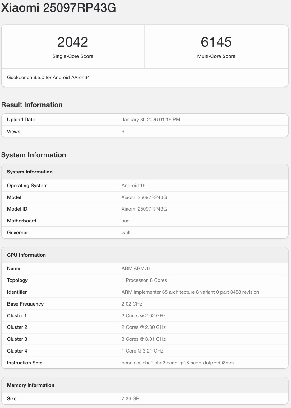 Geekbench-listan avslöjar också att den globala Xiaomi Pad 8 körs Android 16. Andra specifikationer är fortfarande obekräftade men liknar troligen den kinesiska motsvarigheten.