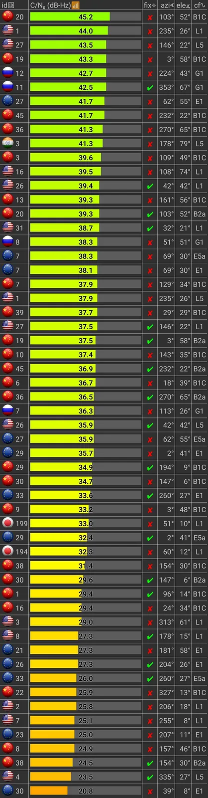 Pixel 10 har ett brett satellitstöd för navigering, inklusive L1+L5 dual-band GPS, GLONASS (L1/G1), Galileo (E1+E5a), BeiDou (B1C+B2a), QZSS (L1+L5) och NavIC (IRNSS L5).