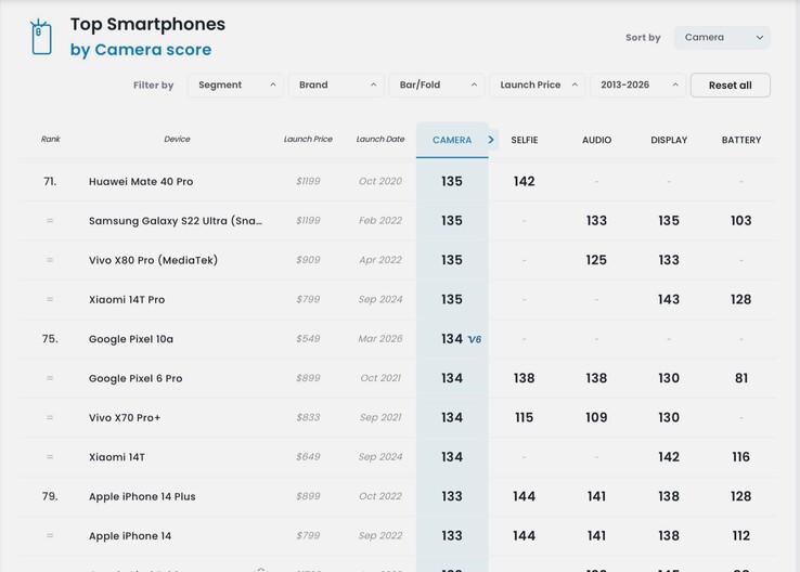 Det är därför knappast förvånande att Pixel 10a endast uppnådde 134 poäng i kameraanalysen på DxOMark kameraanalys - sex poäng mer än Pixel 9a, vilket kan tillskrivas förbättringar i bildbehandlingen. Detta räcker precis till en 75:e plats på DxOMark camera charts. Med 136 poäng presterar till och med Pixel 8a bättre, för för två år sedan installerade Google en 64 MP huvudkamera med en större 1/1,73 tums sensor. Den mycket äldre Apple iPhone 15 ligger långt före Pixel 10a med 145 poäng