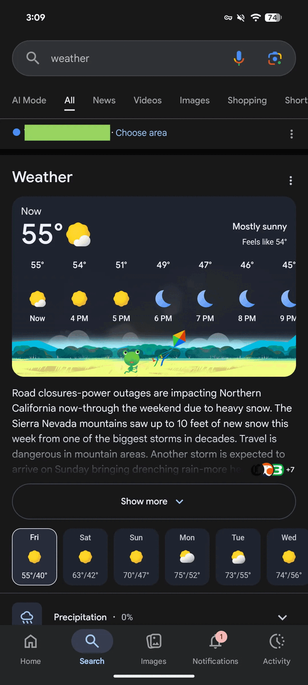 Genom att trycka på genvägen Väder på hemskärmen kommer användarna nu till en resultatsida för Google Search-väder, som visar prognosdata med ett välbekant Froggy-bakgrundskort, komplett med en AI-vädersammanfattning, standardkarusell för 10-dagars prognos och rullgardinsmenyer för luftkvalitet, luftfuktighet, vind och nederbörd.