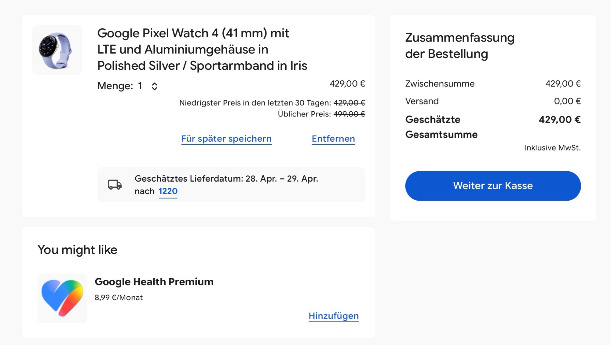 Om du för närvarande lägger till en Pixel Watch 4 i kundvagnen i Googles onlinebutikrekommenderar Google denna nya "Google Health Premium"-prenumeration till ett pris av 8,99 euro per månad. Som 9to5Google upptäckte, är prenumerationen redan listad i Fitbit-appen, antingen för $ 9,99 per månad eller för $ 99,99 per år. Den årliga prenumerationen kostar därför $ 20 mer än Fitbit Premium. Det är ännu inte känt om Google Health Premium är avsett som ett komplement eller ersättning för Fitbit Premium.