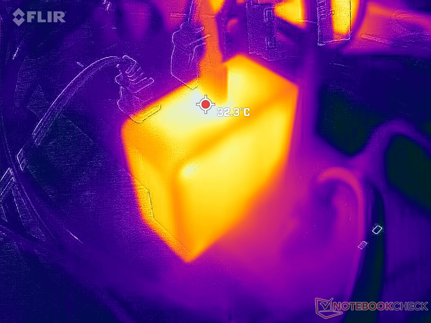 Temperaturutvecklingen är i stort sett symmetrisk på grund av den symmetriska kylningslösningen. De heta punkterna i tangentbordets mitt och på undersidan kan bli så varma som 39 C respektive 43 C när man kör krävande belastningar under långa perioder. Detta är varmare än på Spectre x360 13.5 samtidigt som det är svalare änFramework Laptop 13.5 båda drivs av långsammare Intel-processorer.