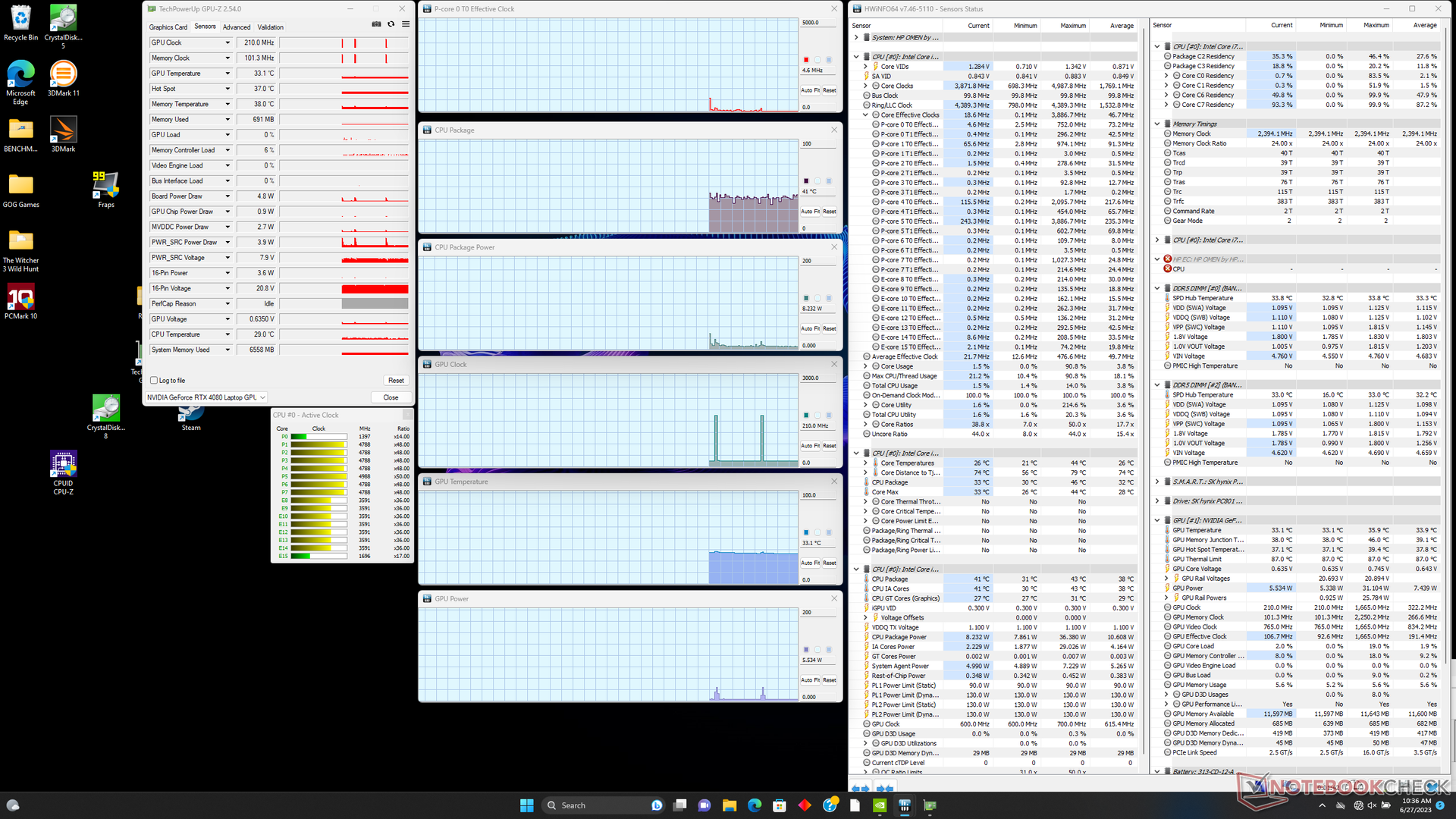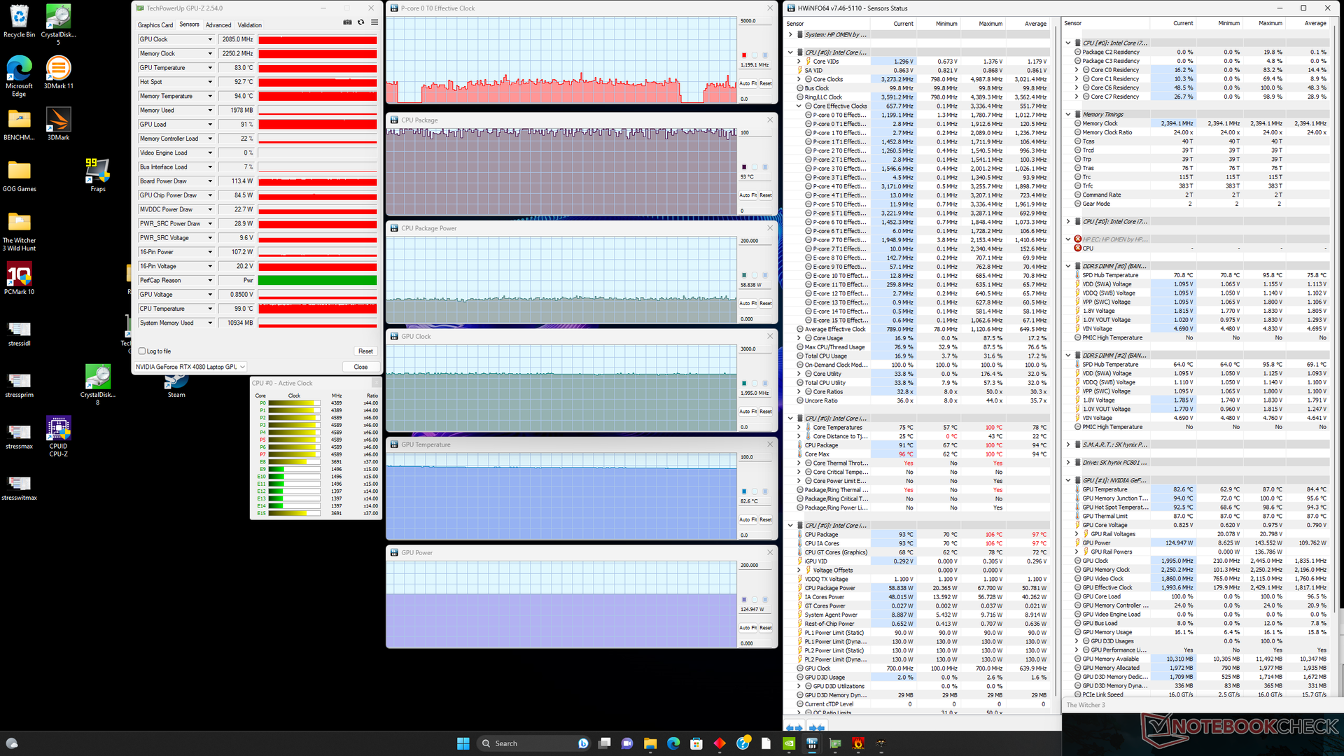 Vid körning Witcher 3 i prestandaläget med Max Fan på, skulle GPU-klockfrekvenserna och kortets strömförbrukning vara något högre än i prestandaläget med Max Fan av, vilket framgår av våra skärmdumpar nedan. Resultaten matchar våra Fire Strike -resultat ovan och kärntemperaturerna skulle också vara märkbart svalare med Max Fan på. Du måste alltså aktivera Man Fan-läget om du vill få ut så mycket prestanda som möjligt ur den bärbara datorn.