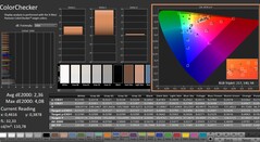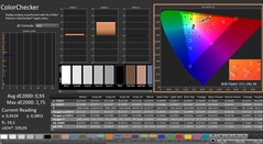 Skärmen har en utmärkt färgåtergivning direkt från start. Med en genomsnittlig färgskillnad på cirka 2,4 ligger den på en nivå som vi anser vara bra (Delta E < 3). Kalibrering av skärmen minskade den genomsnittliga Delta E till 0,93 och resulterade i en mer balanserad gråskala. Panelen kan återge hela sRGB-färgrymden, men har inte full AdobeRGB- och DCI-P3-täckning. Skärmarna på konkurrerande enheter har mer att erbjuda på det här området.