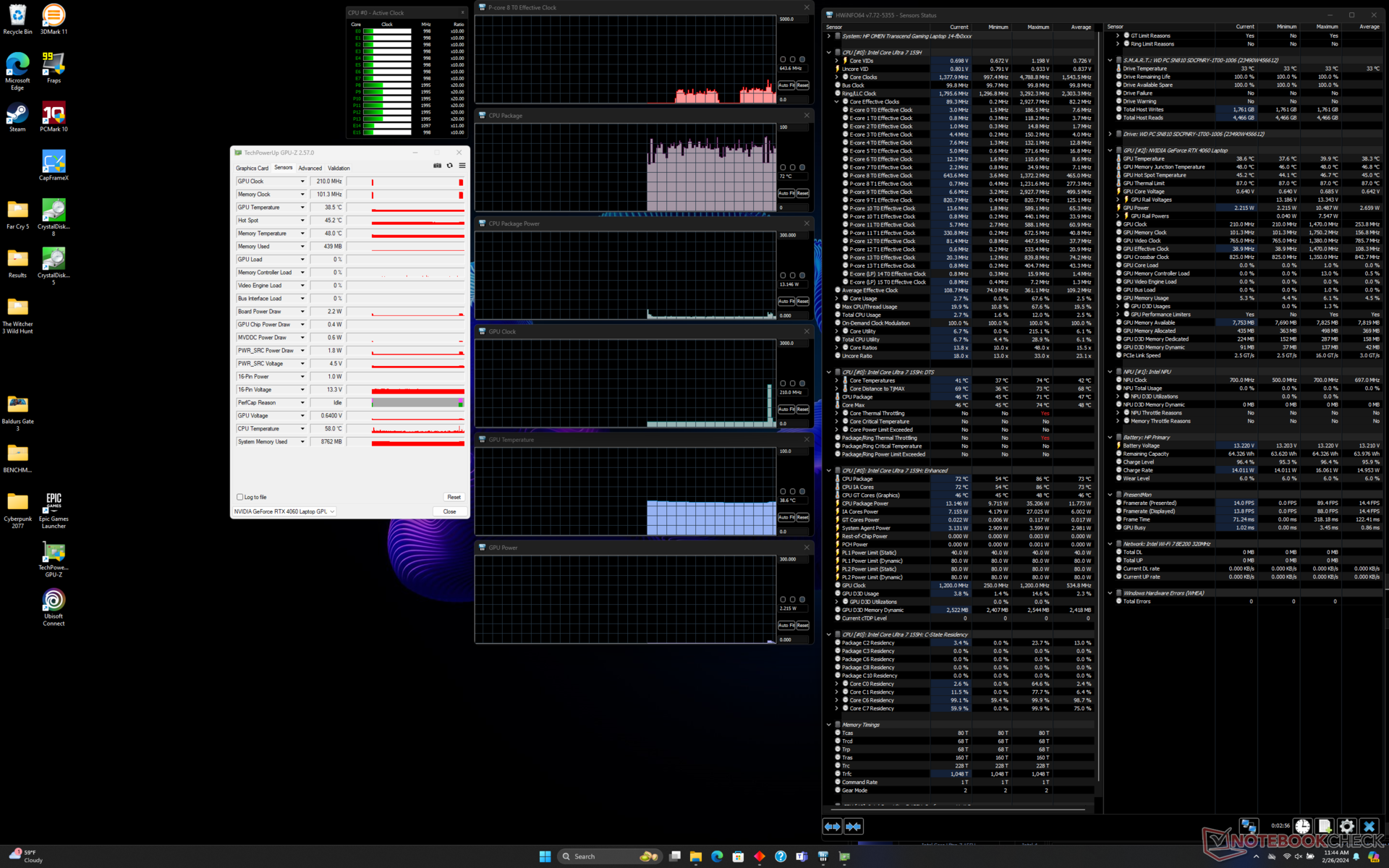 Löpande Witcher 3 drar ca 118 W för att vara jämförbar med Zephyrus G14 men fortfarande mycket lägre än Blade 14. Skillnaden i förbrukning mellan vår Omen Transcend 14 och Blade 14 är cirka 60 W med mycket av det som tillskrivs det högre TGP-målet för det tyngre Razer-systemet.