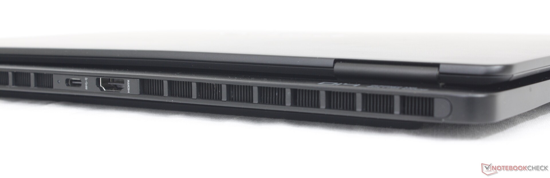 Portalternativen är identiska med Razer Blade 14 om än omarrangerade. Tänk på att även om systemet kan laddas via någon av de två USB-C-portarna, är det bara den bakre USB-C-porten som stöder 140 W laddning. Nätadaptern måste därför anslutas till den bakre USB-C-porten för full systemprestanda, annars visas en popup som meddelar användaren om minskad prestanda om nätadaptern är ansluten till "fel" USB-C-port.